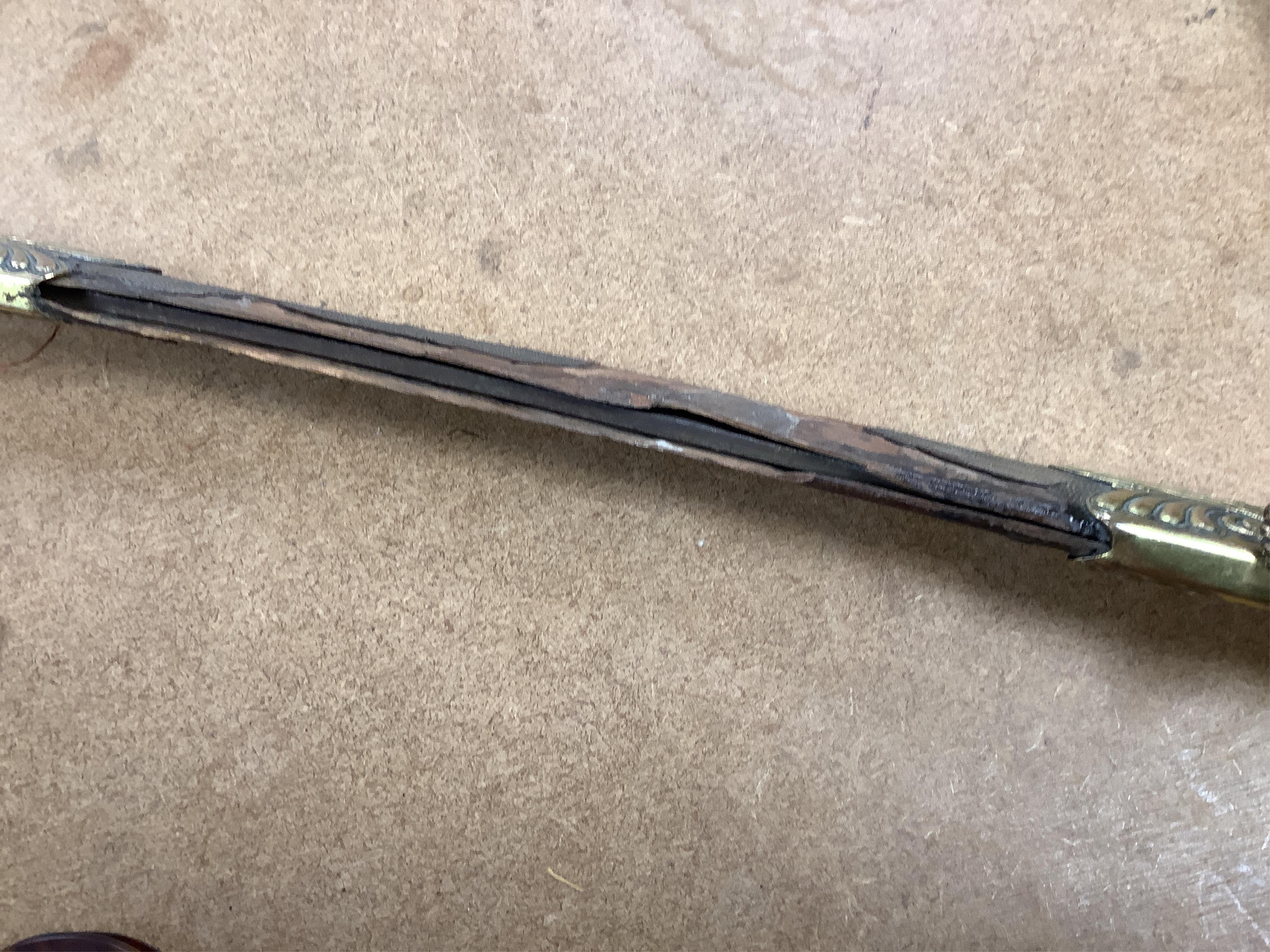 Significant damage and losses to the scabbard. Scabbard engraved with script, “To The King and their Royal Highnesses, Prince of Wales Dule of York & Cumberland. No. 9, Charring Cross”. The blade is in a very similar style to other blades of that period and from the Lviv area. We have not translated the Islamic inscription. The grip is ivory and cannot be shipped to the US.