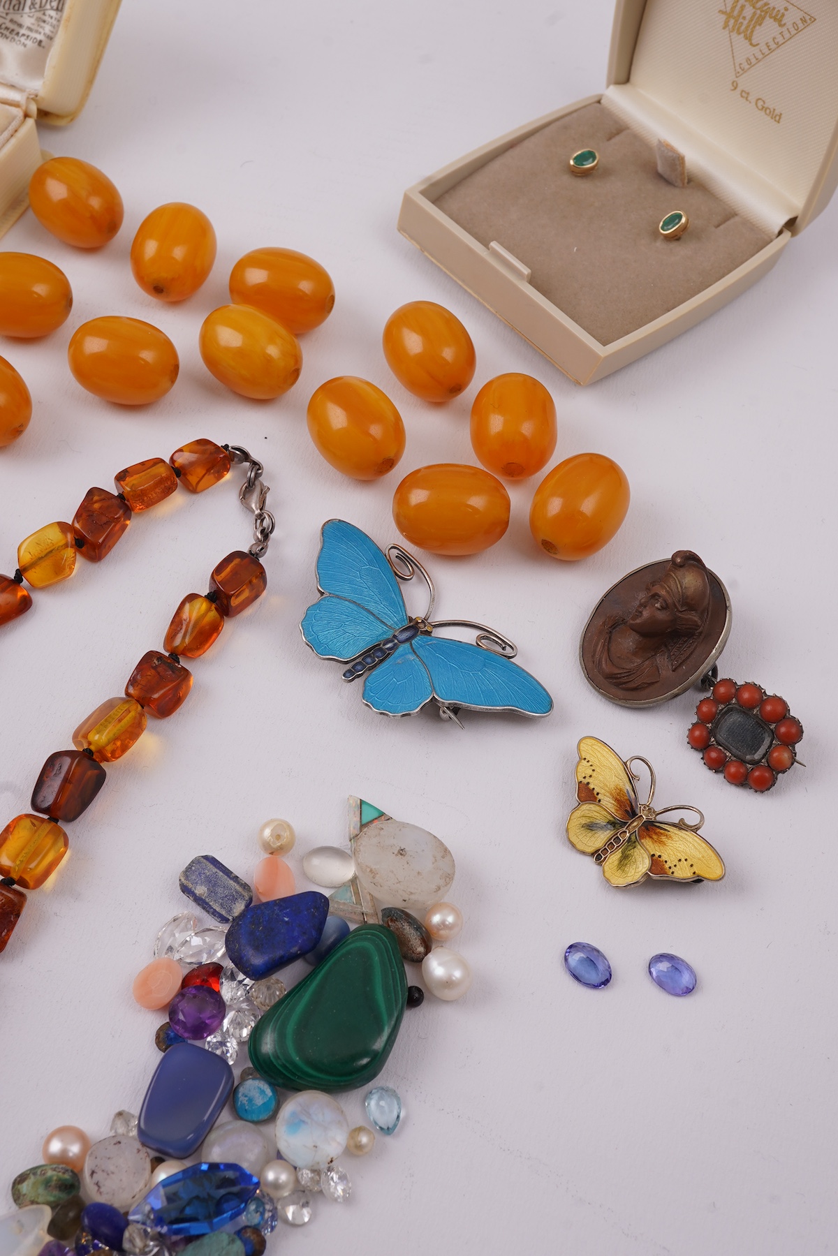 A collection of jewels, comprising: an aquamarine and diamond bracelet mounted in 9ct gold, length 19.5cm, British hallmarks, gross weight approximately 6.5 grams; a three-stone garnet ring in 9ct gold, British hallmarks, gross weight approximately 2 grams; an emerald and diamond half hoop ring and a pair of oval emerald stud earrings, combined gross weight approximately 2.5 grams; an early 19th century coral and hairwork brooch; a lava cameo brooch; two silver and enamel butterfly brooches, largest 5.3cm; a rose-cut garnet brooch; an amethyst geode pendant mounted in gilt metal; an amethyst pendant; two shell cameo brooches, the smaller in 9ct gold, British hallmarks, gross weight approximately 4.8 grams, the larger in rolled gold; a green chalcedony ring in gold, stamped 9ct, gross weight approximately 2.5 grams; a collection of loose gemstones including opals, tanzanites, moonstones, synthetic and paste stones; a gilt silver and cubic zirconia cluster ring, British hallmarks; two gilt metal chains; two gilt metal bangles; two paste rings; and a collection of simulant amber beads