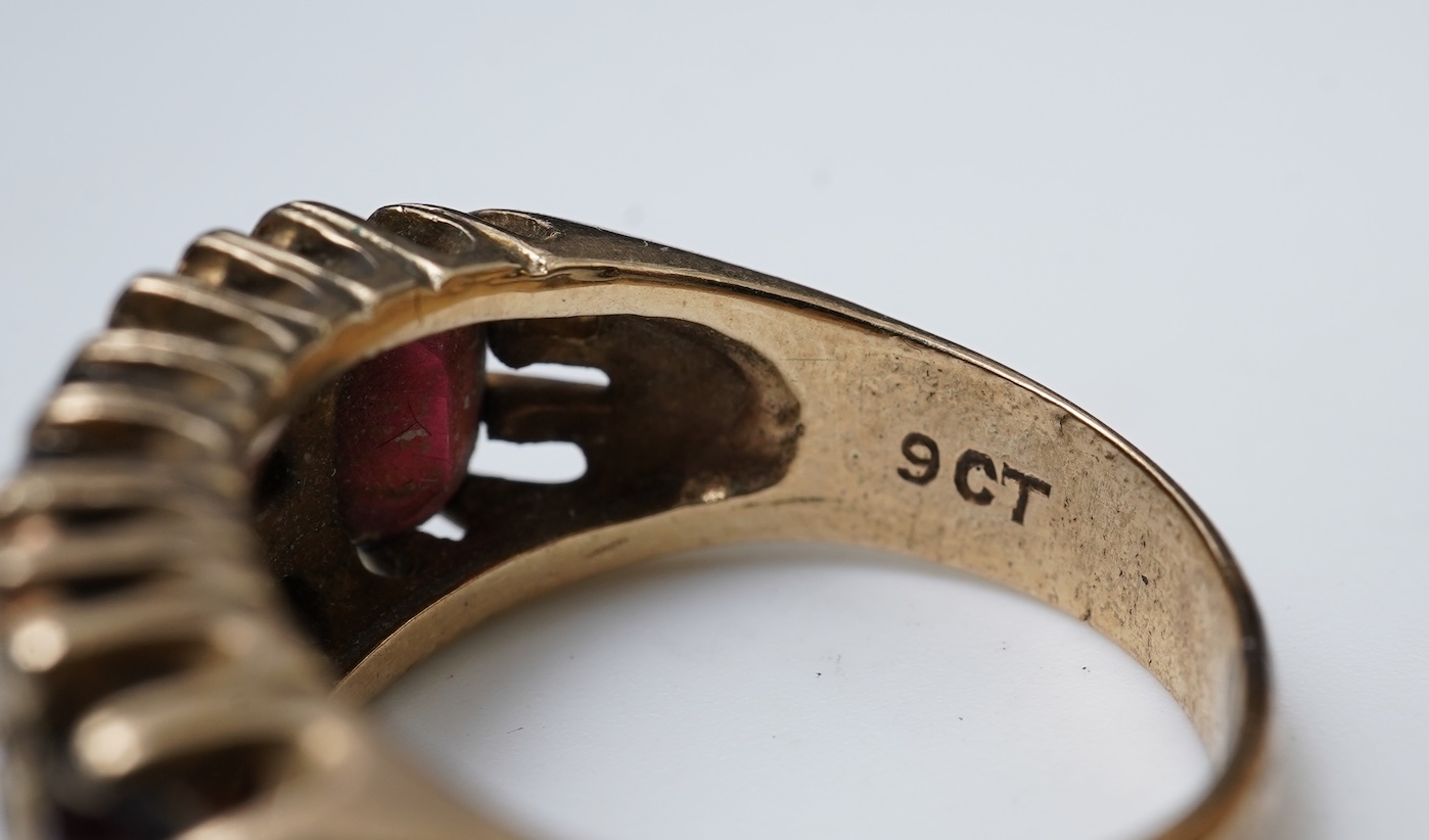 A collection of jewels, comprising: an 18ct gold wedding band, size P1/2, British hallmarks, gross weight 7 grams; three wedding rings, a synthetic ruby and diamond cluster ring and a sapphire and diamond cluster ring, a figaro link chain necklace, a pair of mabé cultured pearl earrings, and a belcher link chain necklace suspending a pendant modelled as the number 3, all with British hallmarks for 9ct gold, combined gross weight approximately 73 grams; two gold watches on gilt metal and leather straps respectively; a single Victorian onyx and diamonds collar stud mounted in gold, gross weight approximately 1 gram; a gold ring with an empty setting, a garnet and colourless paste ring, and a twisted curb chain, all stamped 9CT or 9K, combined gross weight approximately 16 grams; a locket pendant, partial marks, gross weight approximately 2 grams; and a pair of chrysoberyl and ruby drop earrings, post fittings