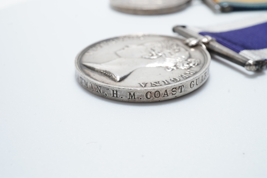 A Victoria and GV medal pair awarded to George S. Woolley, Boatman, H.M. Coast Guard, comprising of a Victoria Royal Naval Long Service and Good Conduct medal and a GV First World War 1914-1918 medal