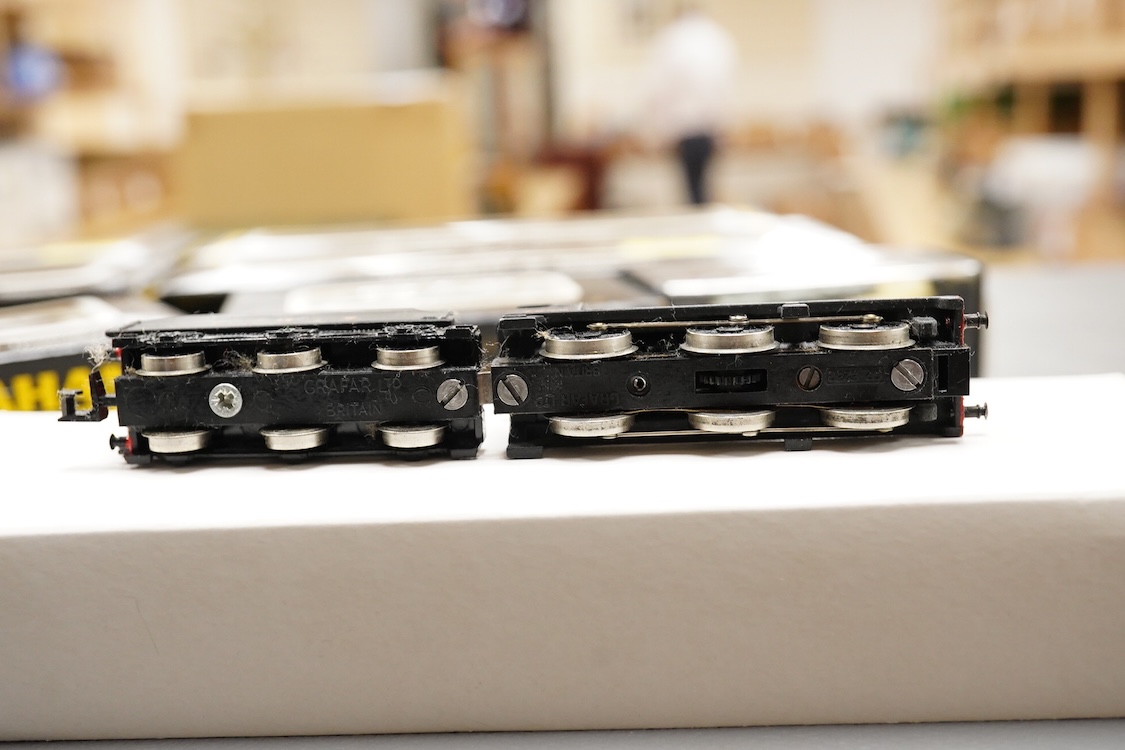 Lot 252 , Thirteen N gauge railway by Graham Farish, etc., including two locomotives; a BR Class 4 0-6-0 tender locomotive, 4232, and an LMS 0-6-0T locomotive, 16389, together with two bogie coaches, eight freight wagons, and a Pe