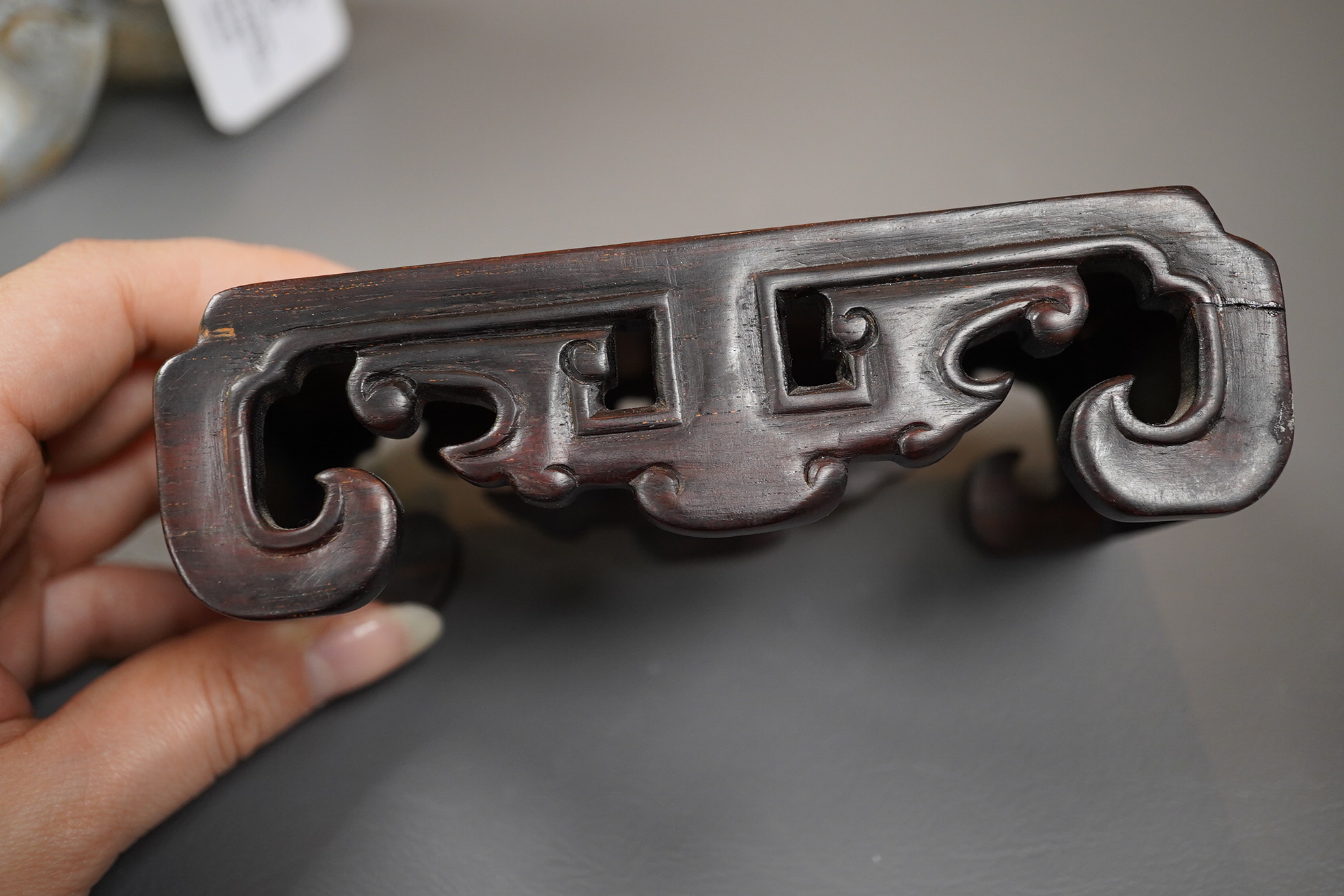 A large Chinese archaistic pale celadon and calcified jade rhyton, on a hardwood stand, 17.5cm high