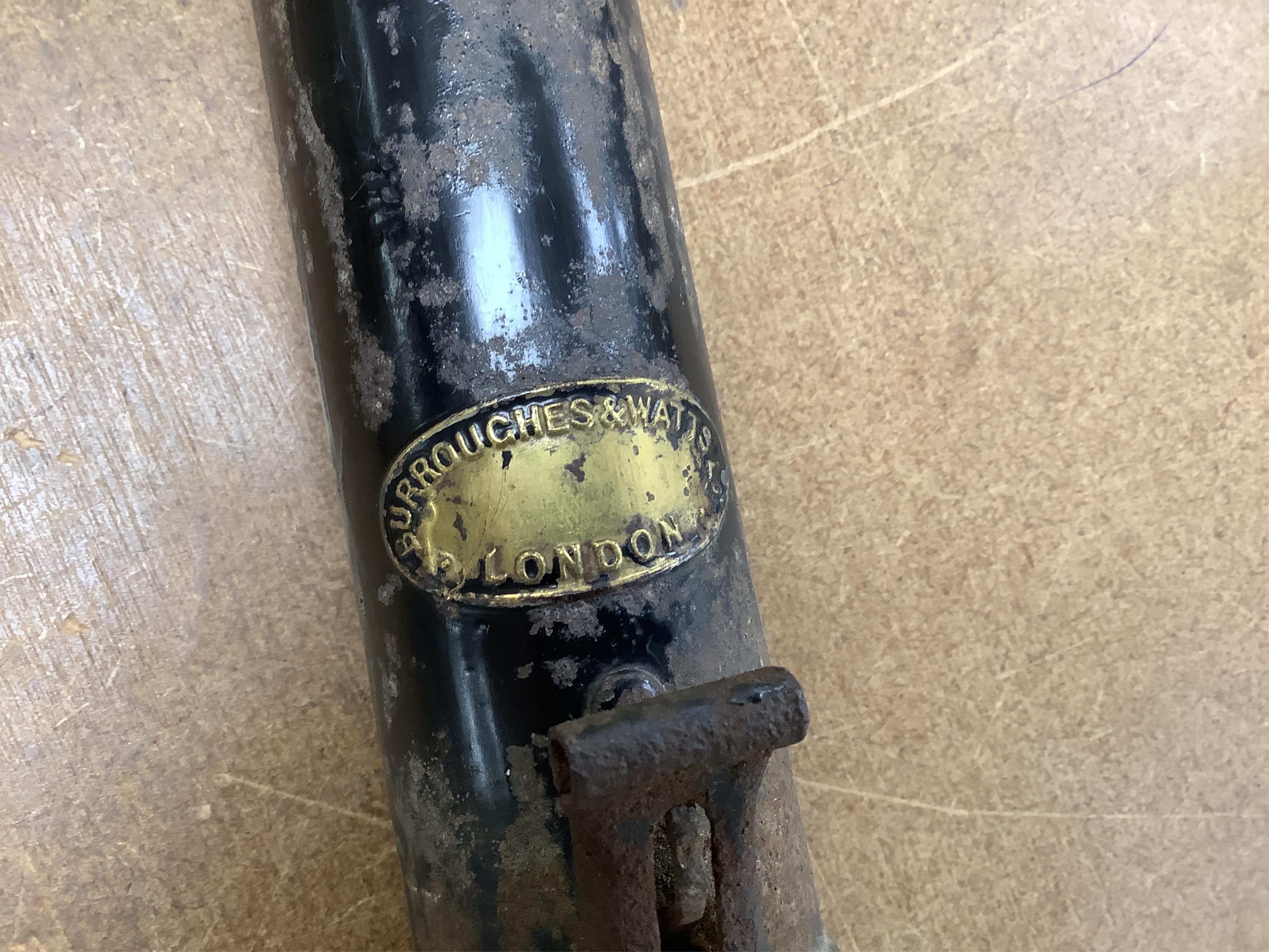 Images 10 to 19 - top blade tip bent; metal wire at blade/shaft joint loose. Centre wood spear stamped FH Ayres, London and numbered 24 in between two arrows; perhaps yew-wood; with a grooved horn finial. Bottom - bent/curved; both grips are wrought iron. Image 21 - the cutter below seems to be missing brass sections at each end and at the stem. Snooker cue signed Burroughches & Watts, London, tin case also same supplier; cue in good, playable condition but tip could be improved upon - see final four images.