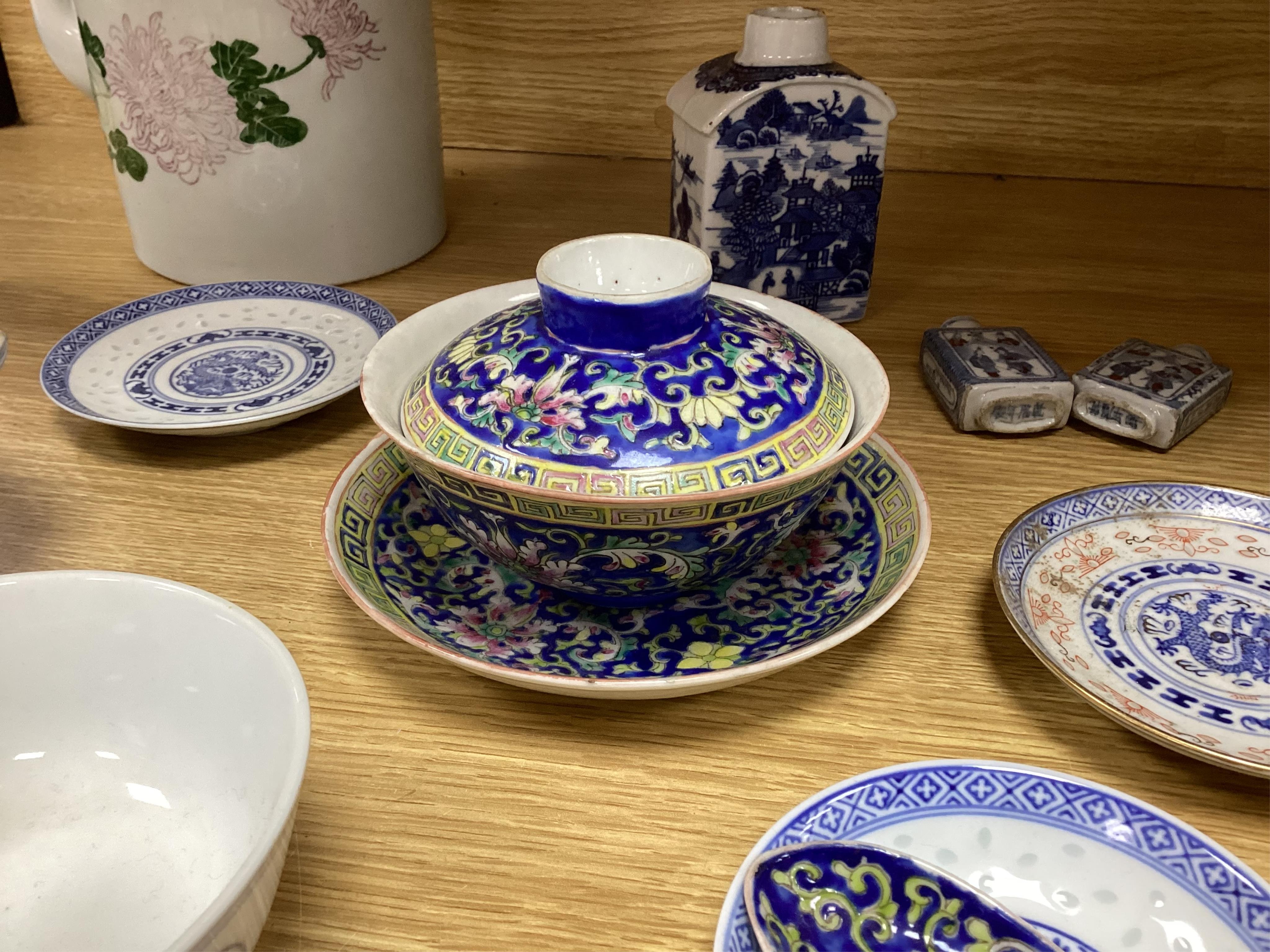 A group of 18th, 19th and 20th century Chinese porcelain vases, dishes, figures, bottles, bowls, jars and covers etc, tallest 32cm
