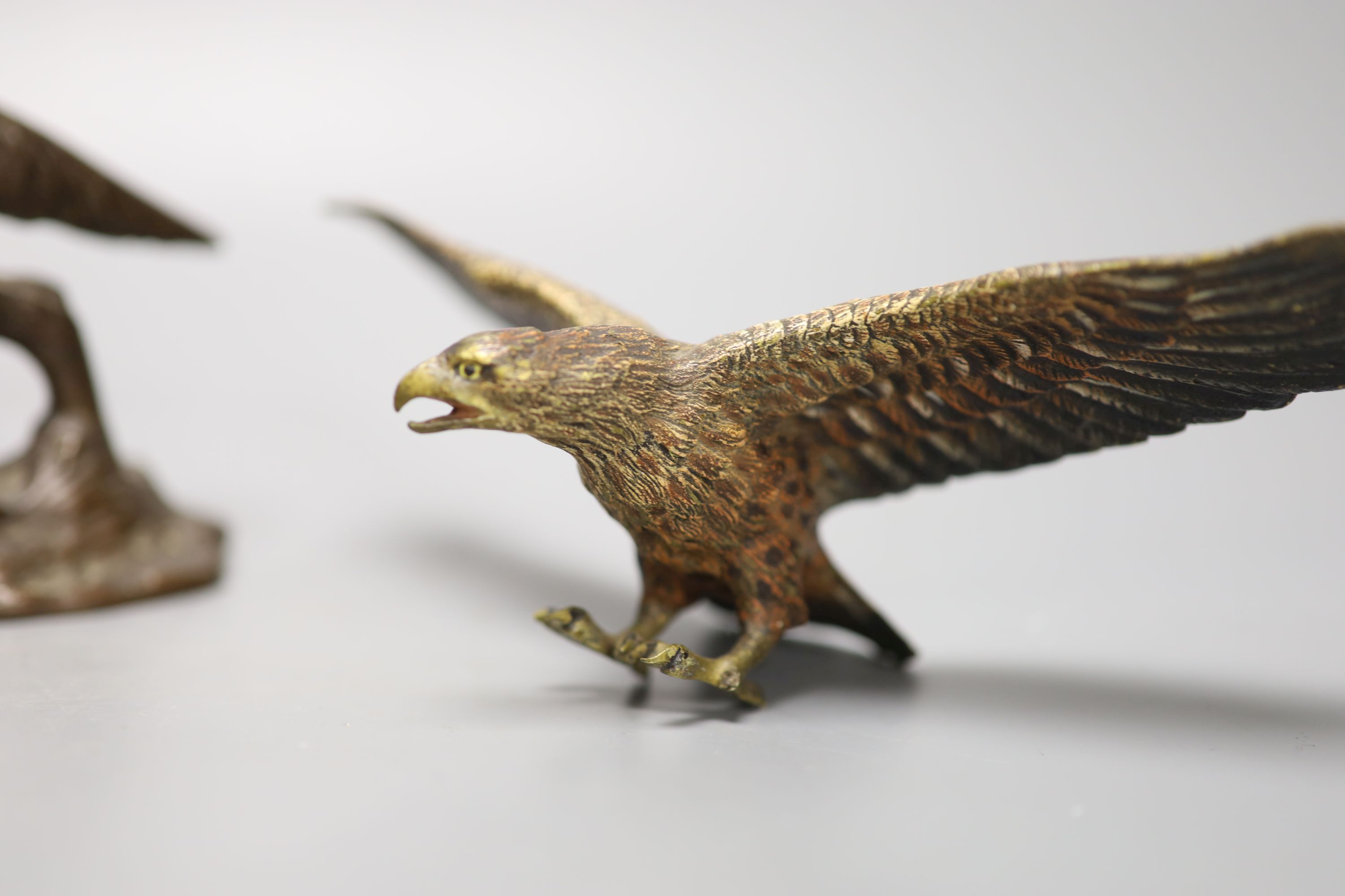 A bronze model of a setter, length 24cm, and a small cold-painted bronze figure of an eagle,