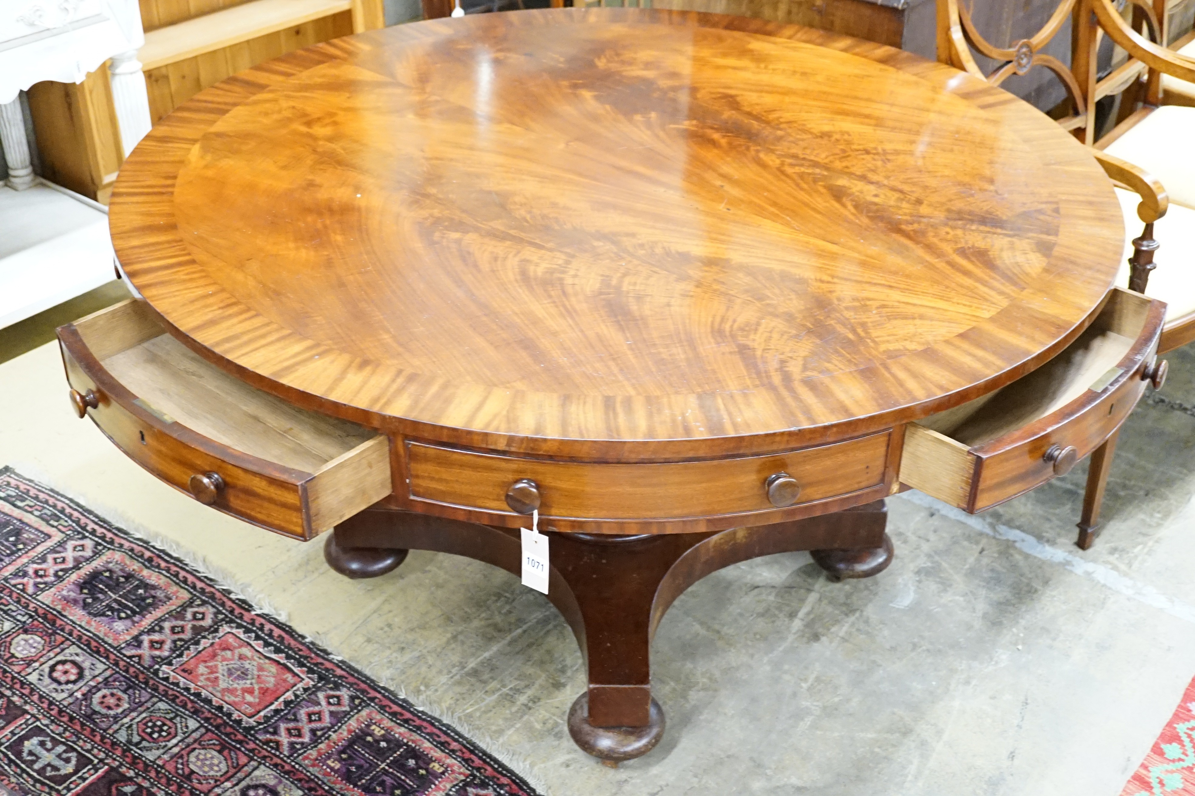 An early Victorian flame mahogany drum top ‘rent’ table, fitted four drawers on turned column saltire platform and brass castors, diameter 138cm, height 74cm