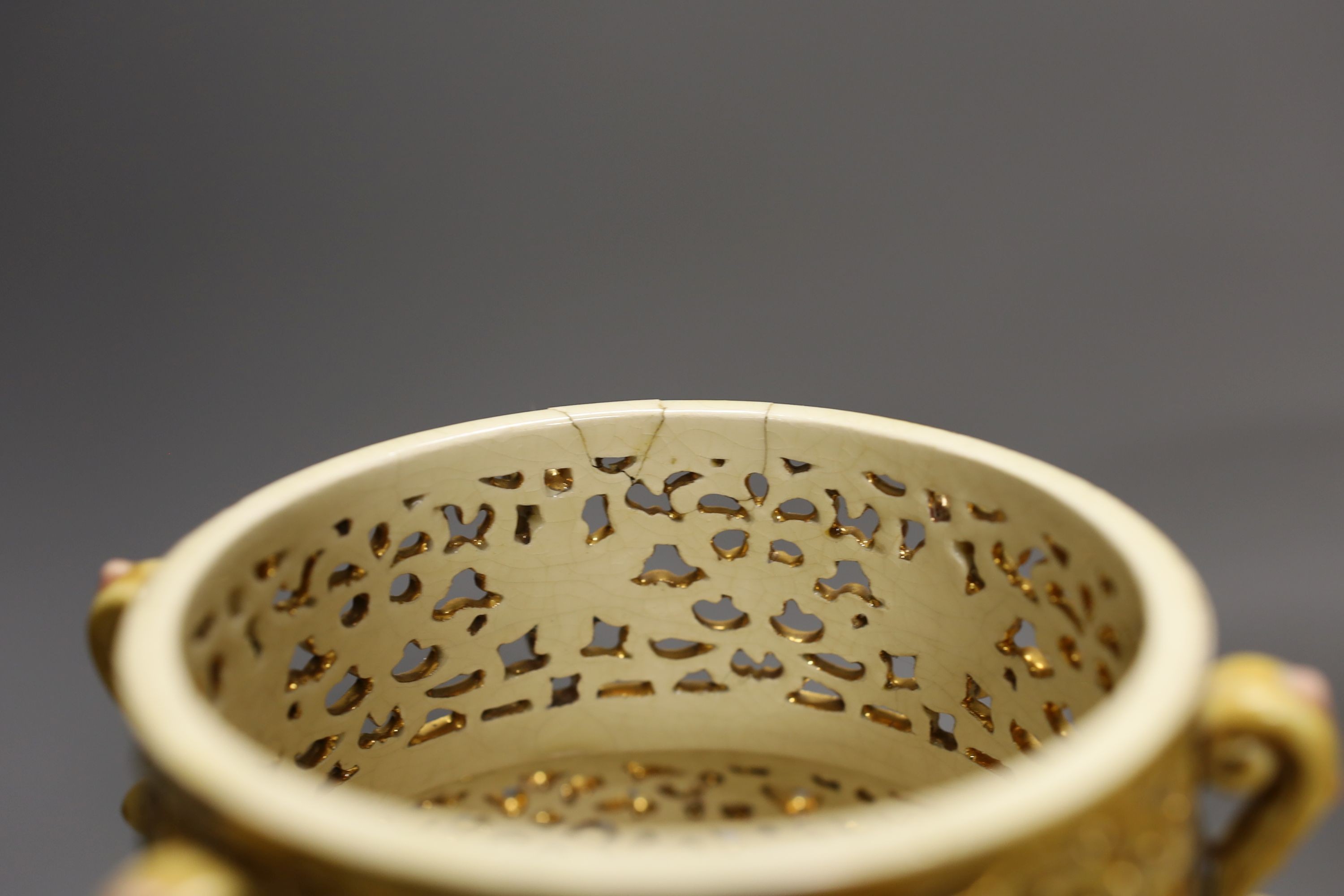 One vase foot chipped and incomplete, approx. 4 x 1mm.; other vase neckrim with repaired chip, approx. 3 x 1mm.; one cover two small shallow chips to underside of flange, not serious.