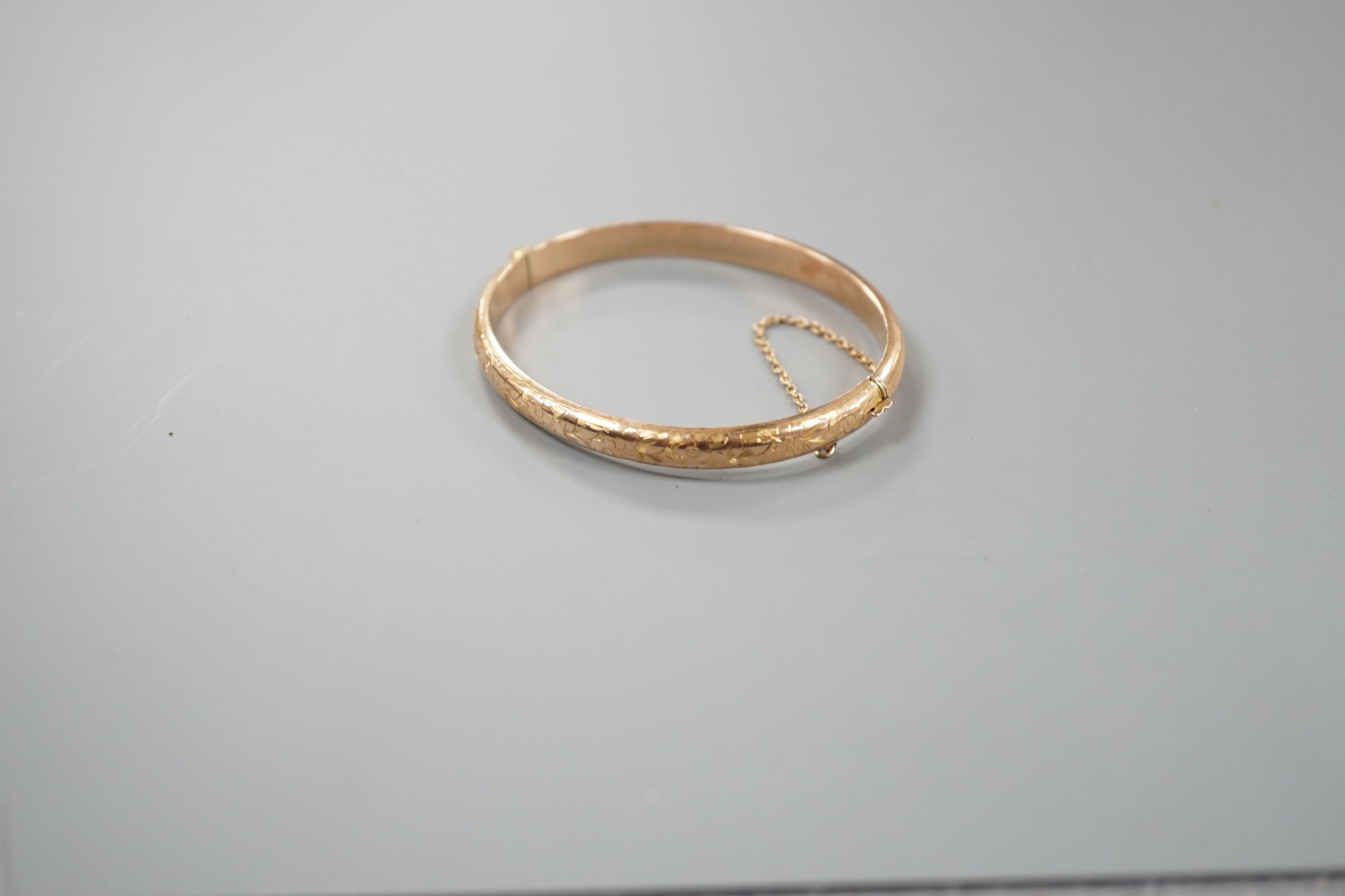 An engraved hollow 9ct gold bangle, 7.6 grams.