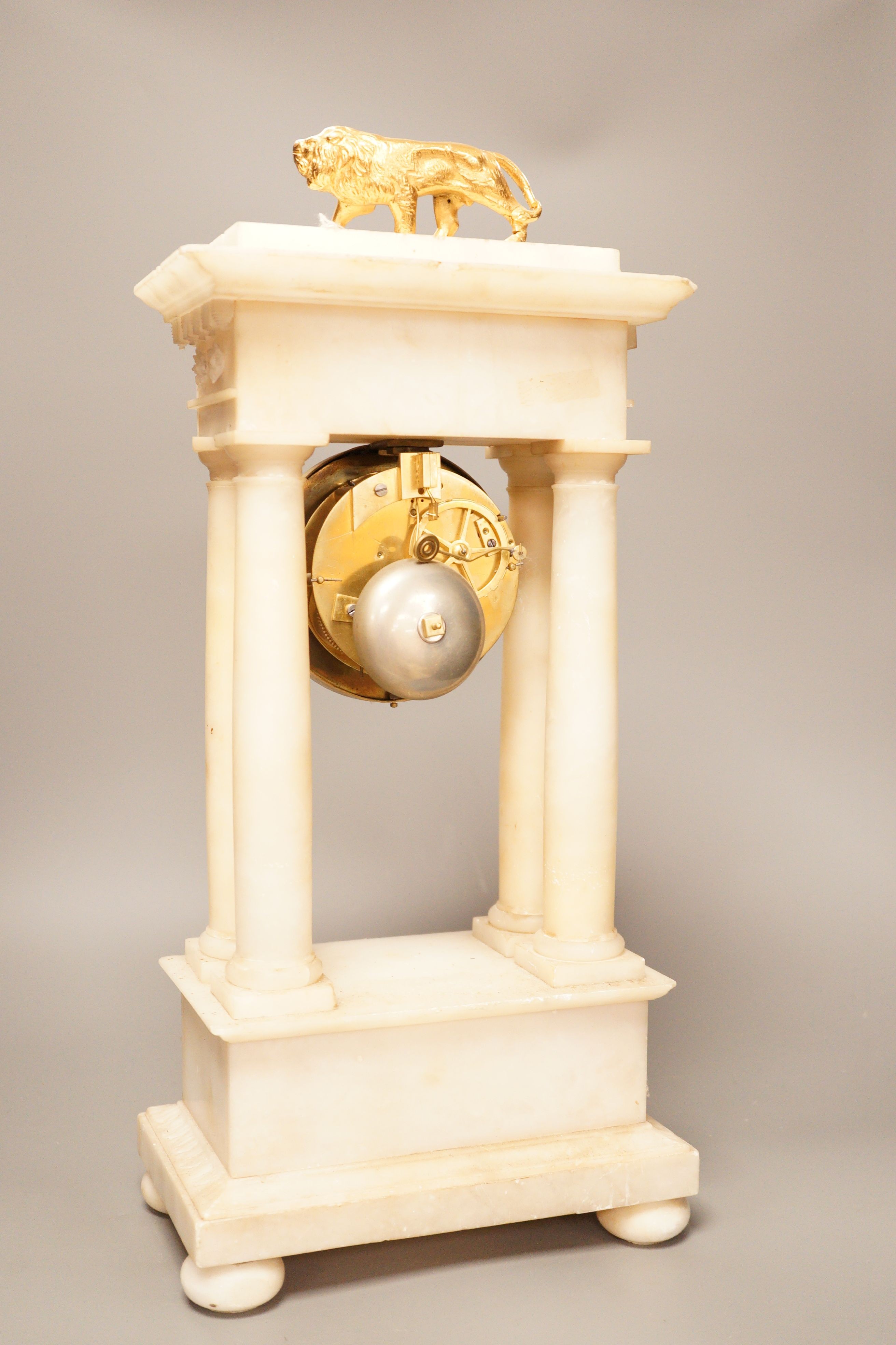 Lot 1396 , A 19th century alabaster portico clock with a gilt metal prowling lion decoration, 50cm tall