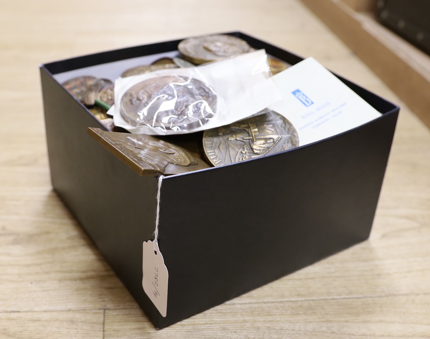 A large and varied collection of mixed cast metal commemorative medallions, mostly European, subjects to include political figures and events, sporting achievements, musical figures, etc, 19th century and later.
