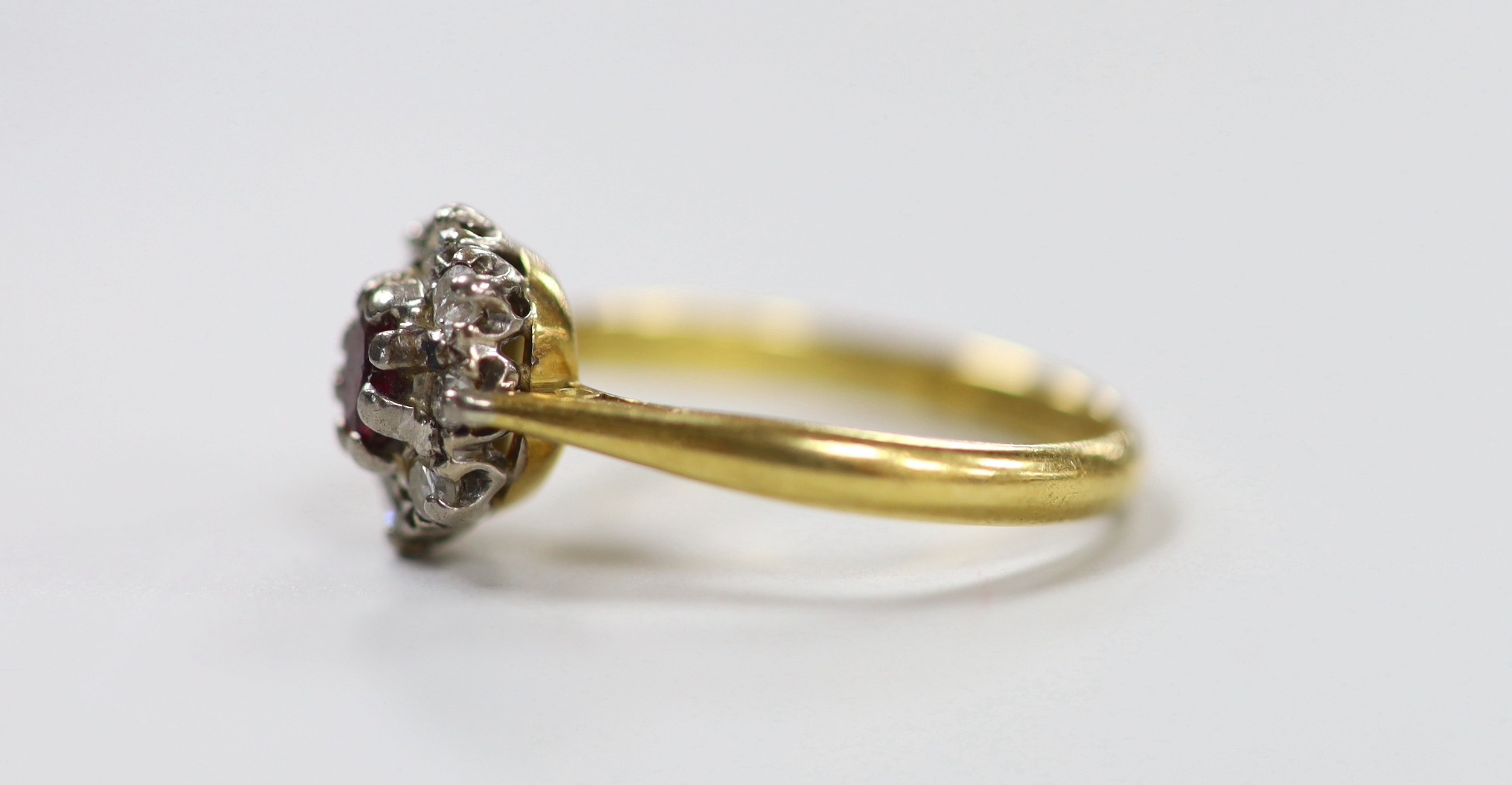 A modern 18ct gold, garnet? and diamond set oval cluster ring, size M, gross weight 3.2 grams.