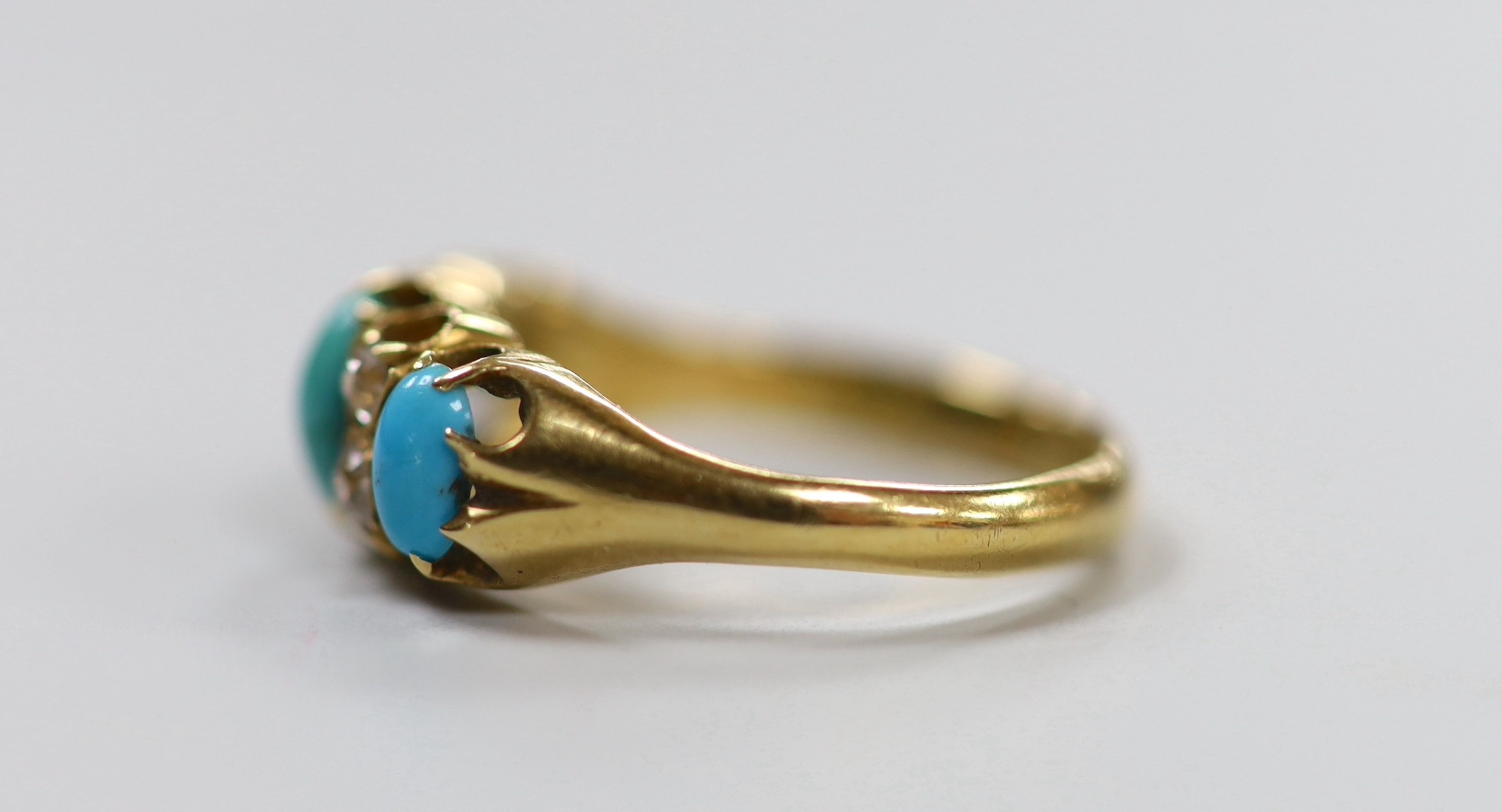 A late Victorian 18ct gold, three stone turquoise and four stone diamond set half hoop ring, size L, gross weight 3.9 grams.