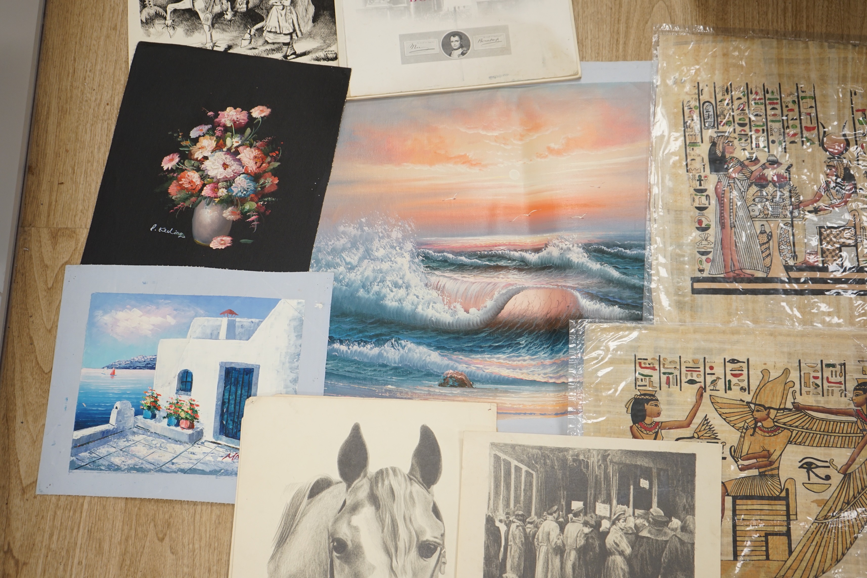 A group of assorted pictures and prints including Egyptian papyrus paintings, 41 x 33cm