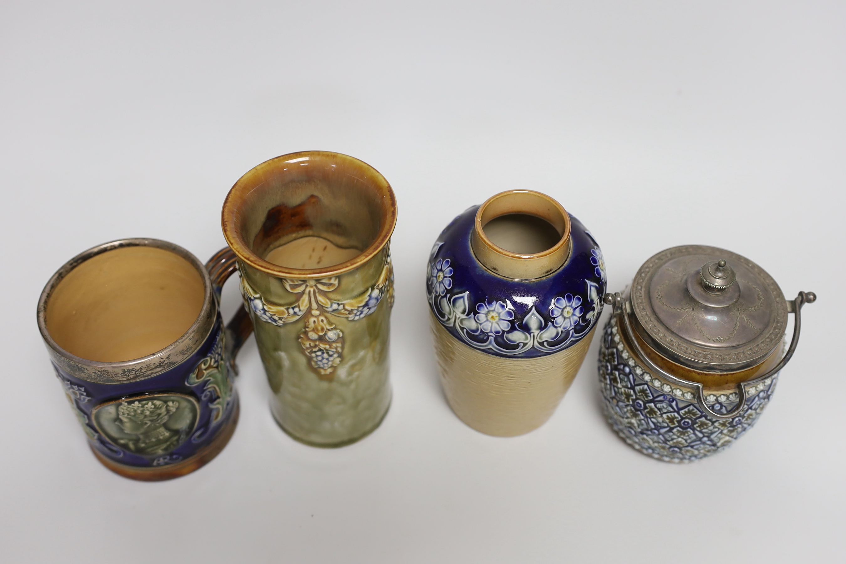 A Doulton Lambeth stoneware silver mounted jar and cover, two vases and a commemorative mug, tallest 15cm