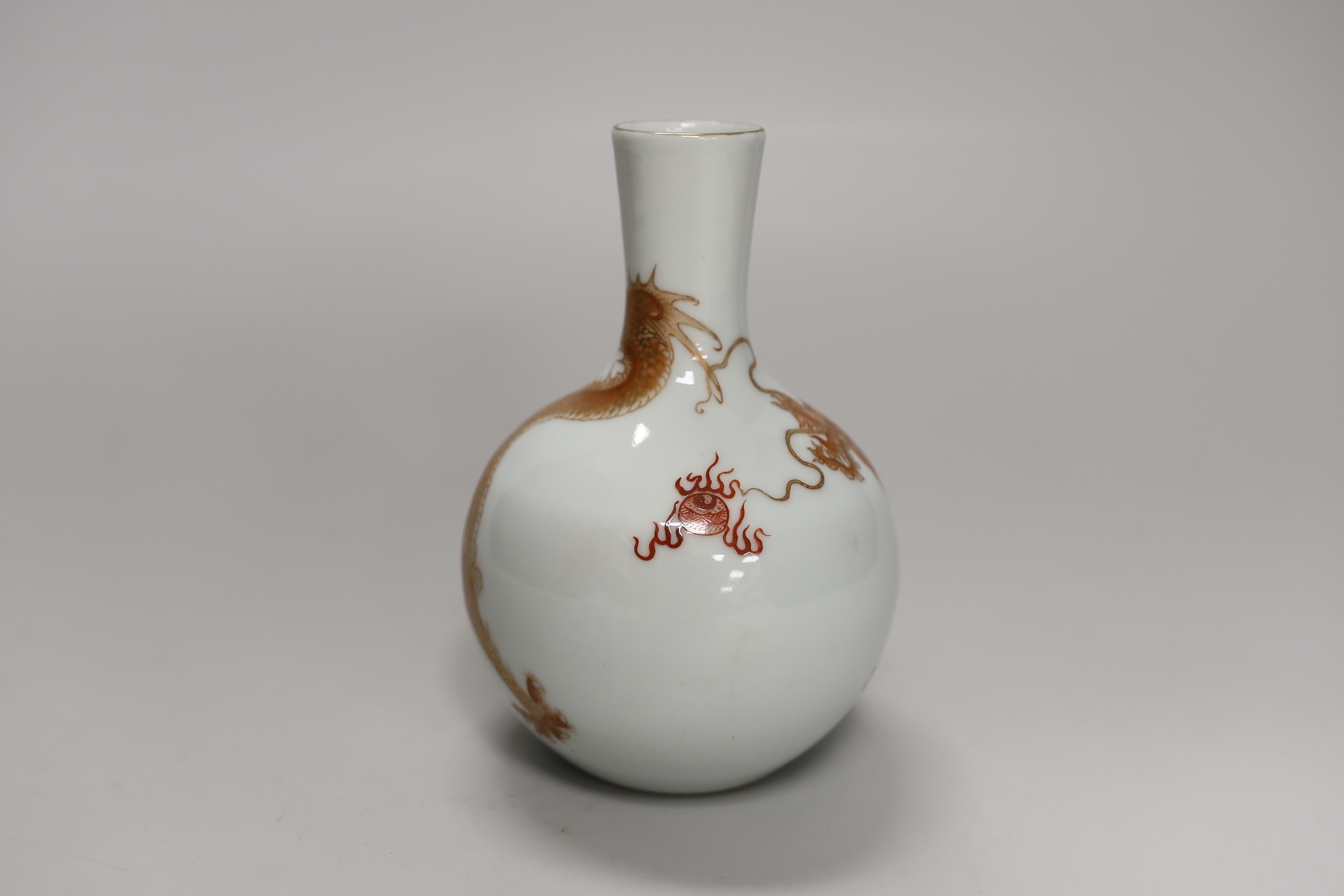 A Chinese rouge de fer decorated ‘dragon’ bottle vase, 14cm high (boxed)