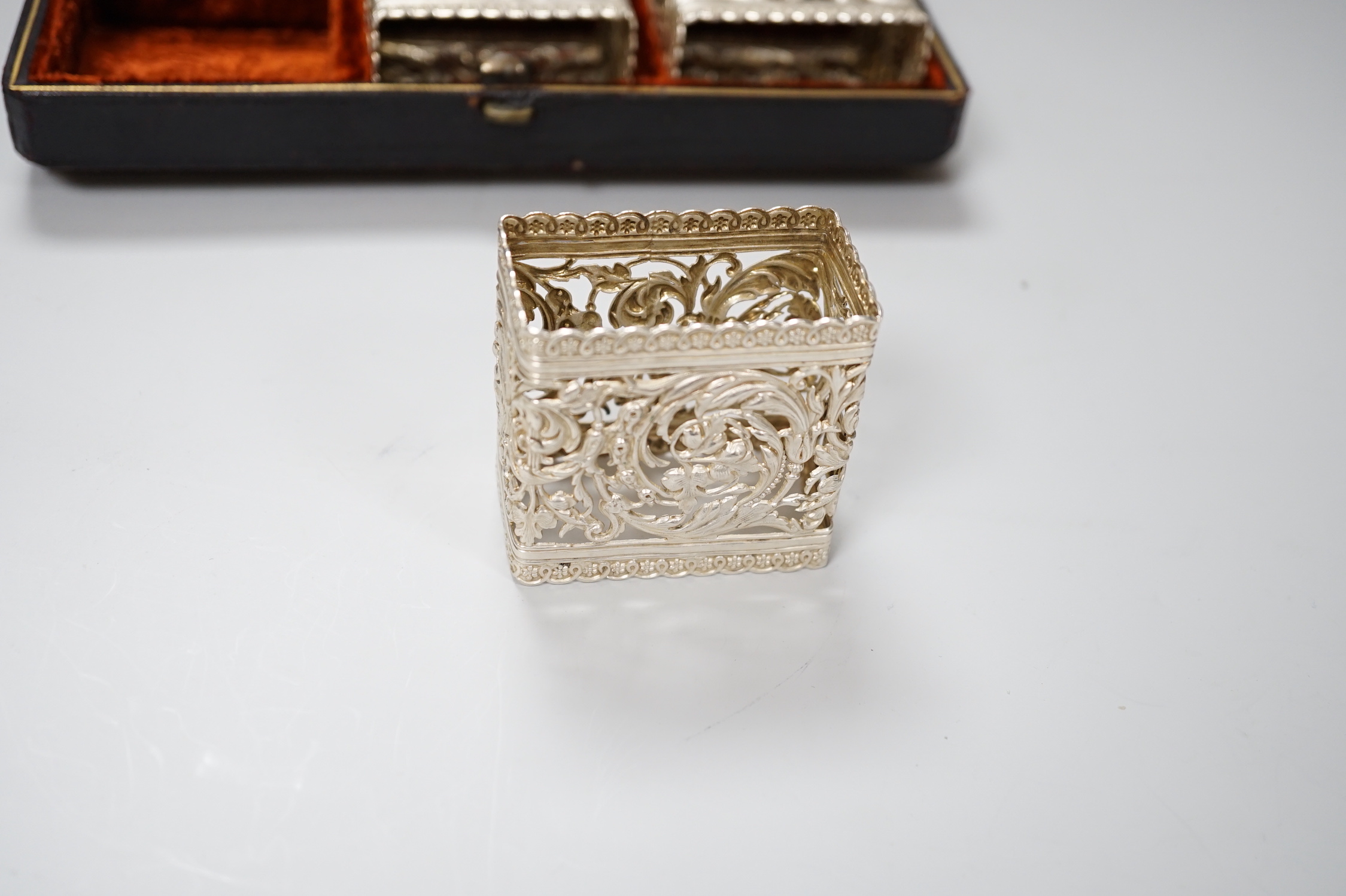 A cased set of six Continental white metal napkin rings, of unusual rounded rectangular form, with foliate scroll pierced decoration, each 5.5cm