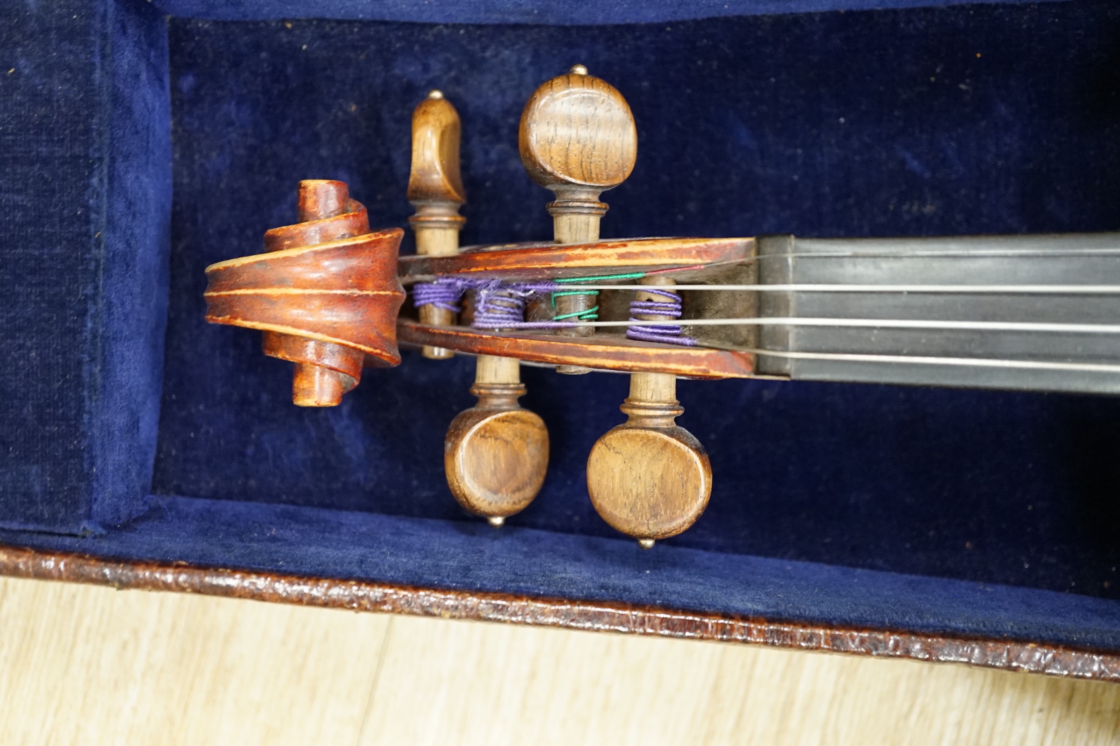 An English cased violin by Thomas J. Bellingham, Leeds, 1909, body length, 35.5cm, with a chased silver mounted bow CITES Submission reference WNR7TU27