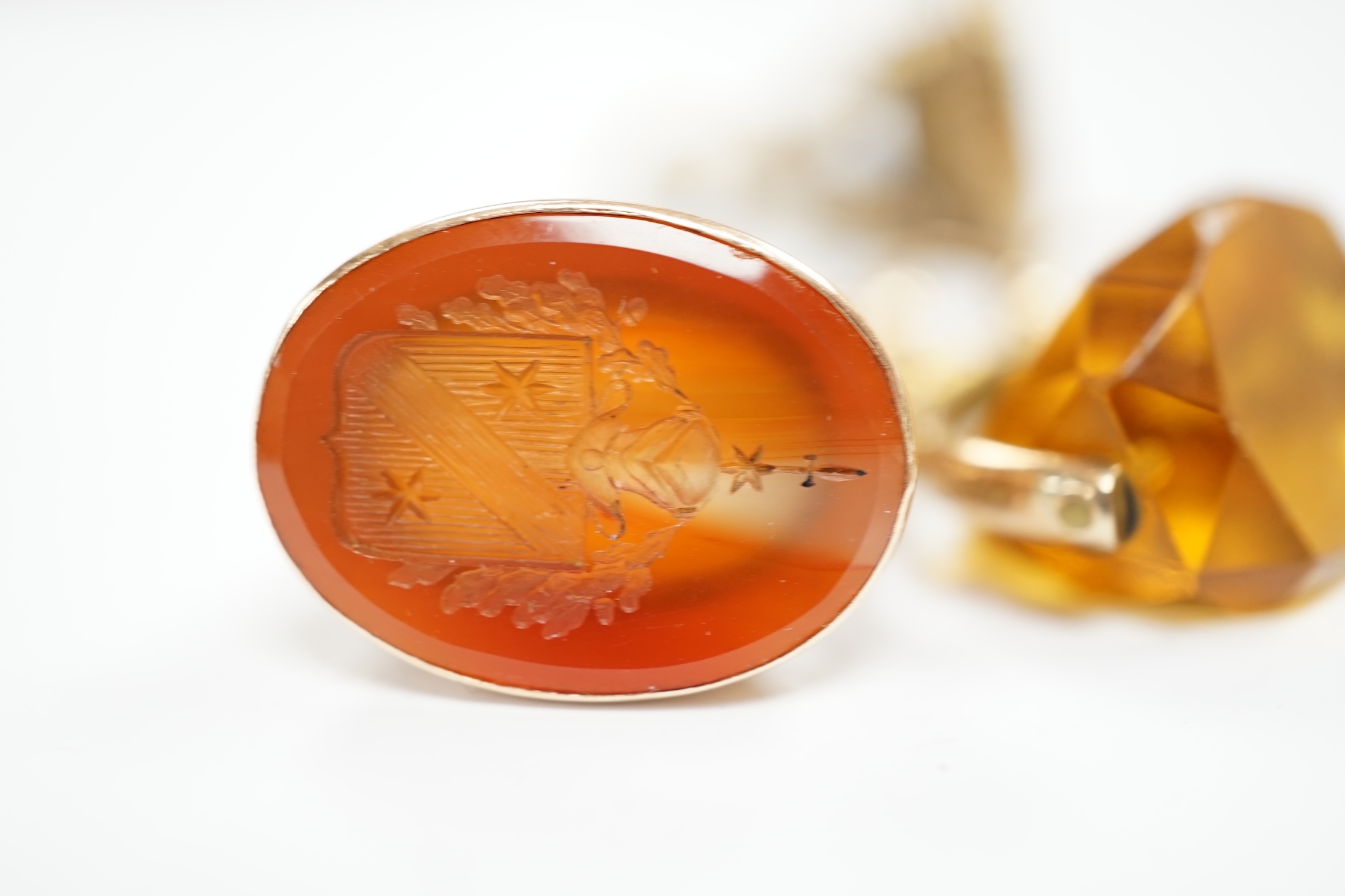 Two 19th century yellow metal overlaid fob seals, one with carnelian stone carved with a crest, 28mm, a base metal table seal and a pinchbeck seal.