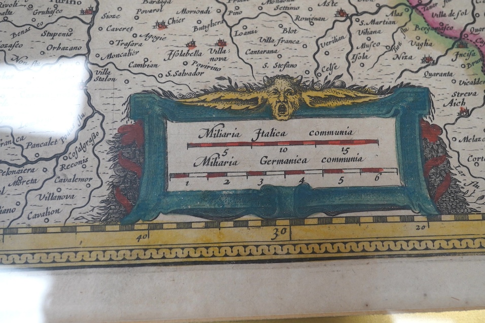 ° Enrico Hondius, hand coloured map of Milan, Mediolanum Ducatus, details verso, 40 x 53cm