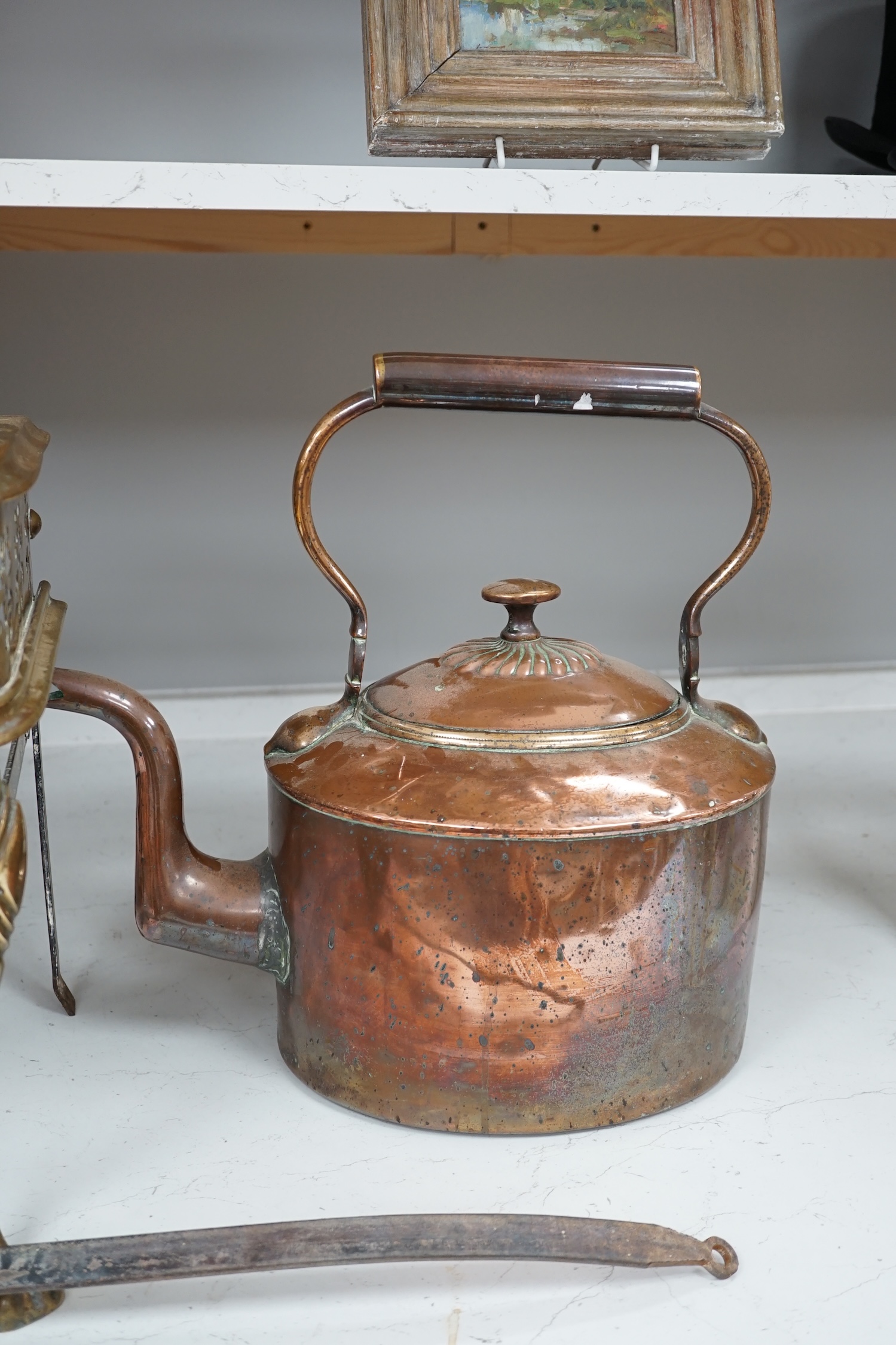 A late Victorian copper kettle, a brass stand and a ladle, largest 39cm wide. Condition - fair