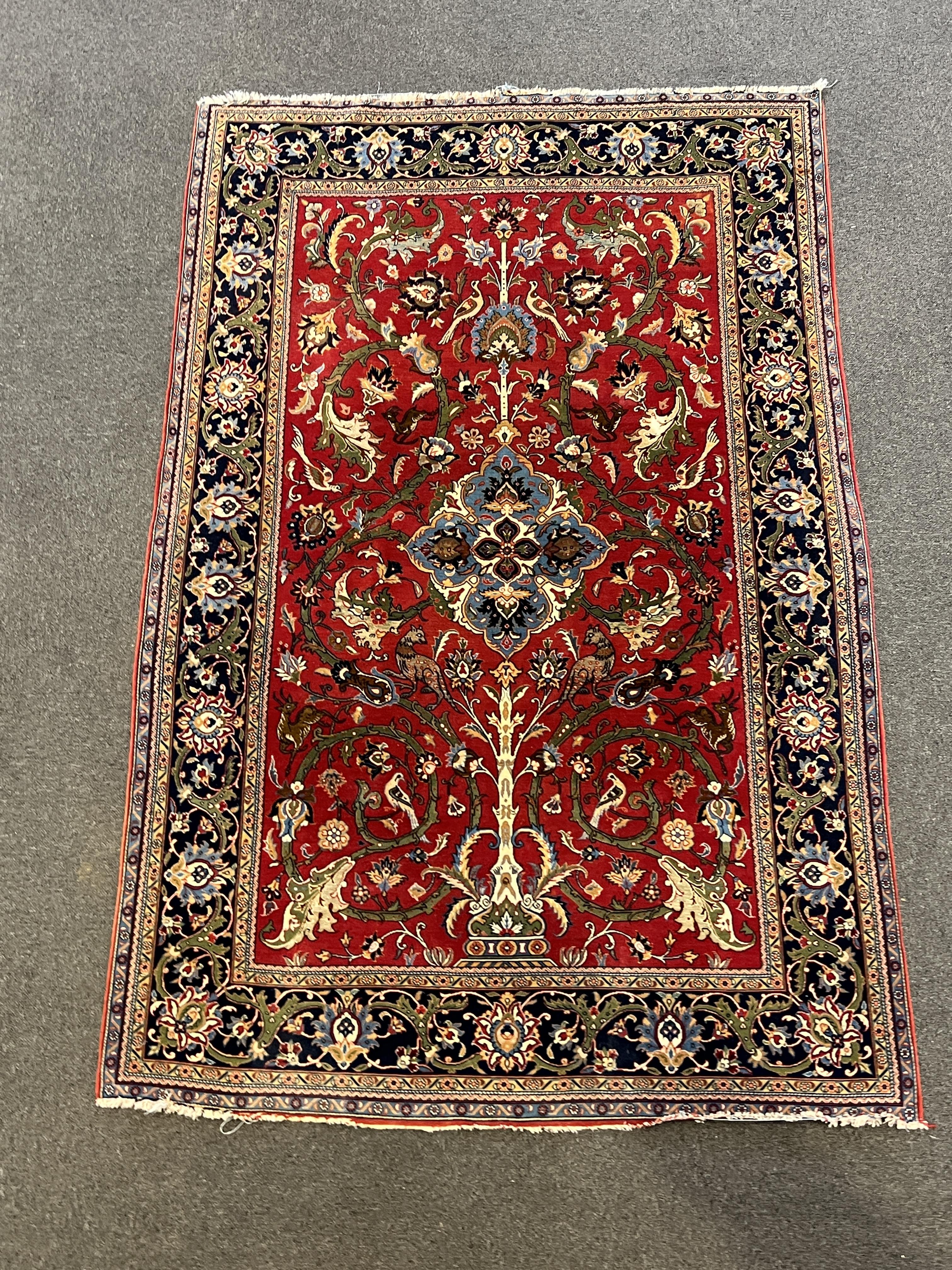 A Kashan red ground rug, woven with scrolling foliage and birds within a dark border, 216 x 138cm. Condition - good