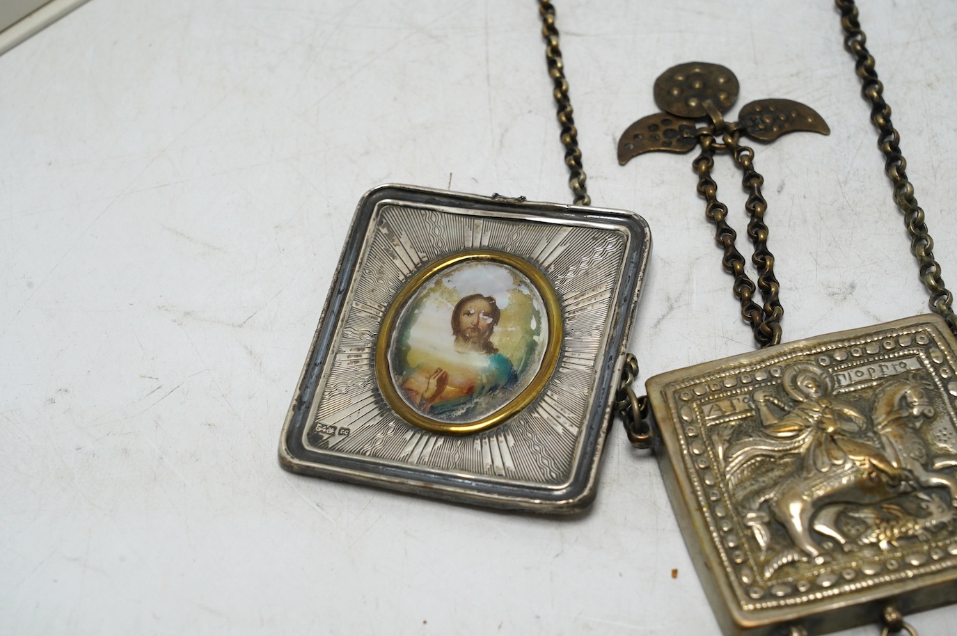 Lot 891 , A Greek white metal pendant, embossed with St. George and the dragon, on a chain and a Russian white metal framed portrait of Christ. Condition - poor to fair