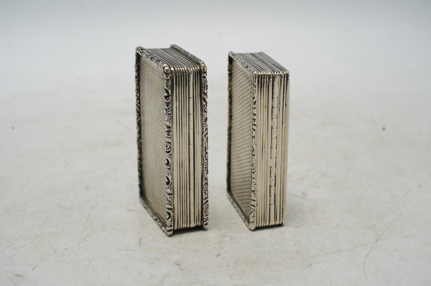 Two late William IV engine turned silver rectangular snuff boxes, Francis Clark, Birmingham, 1835/6, largest 70mm. Condition - fair