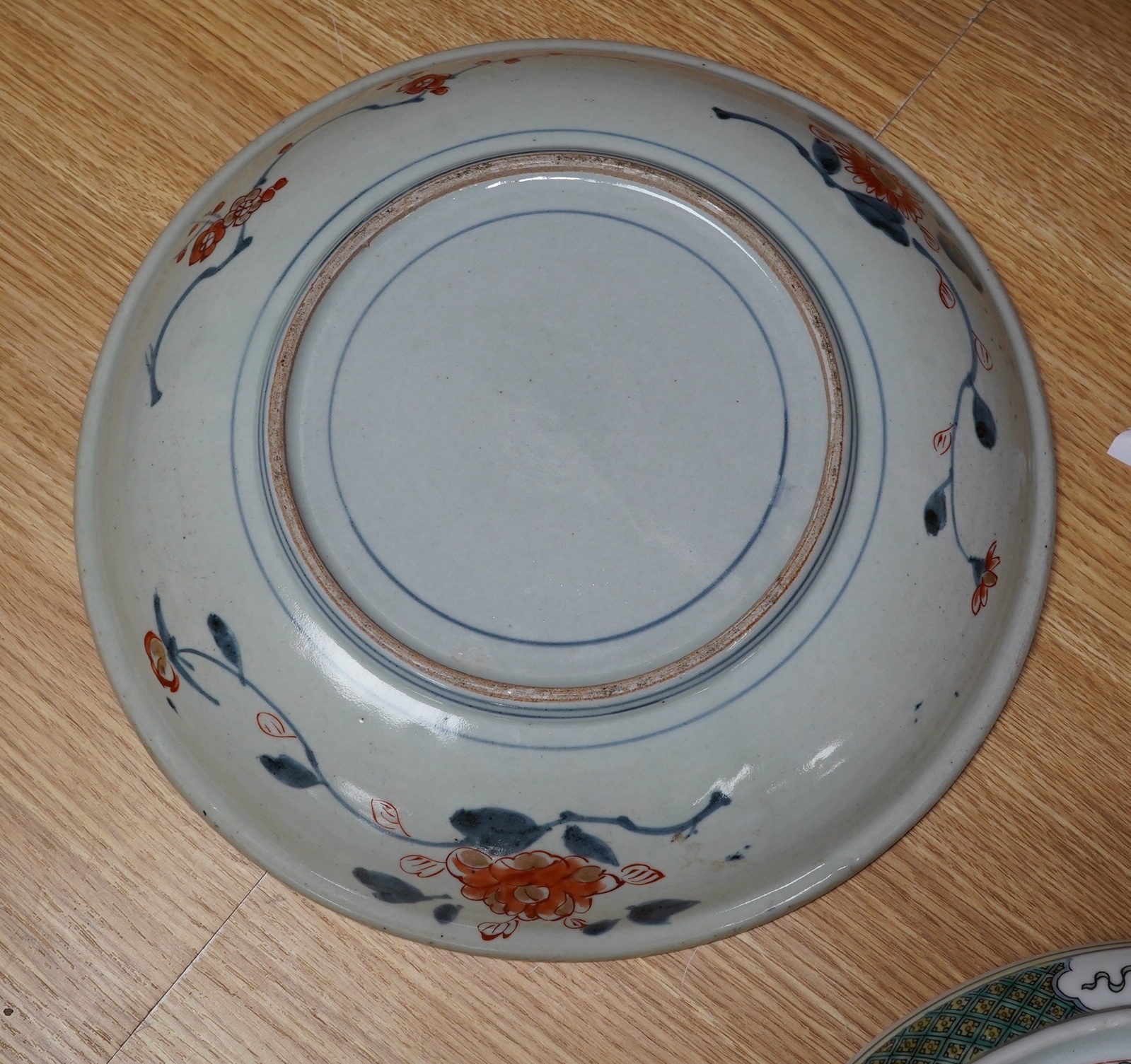 An 18th century Japanese Imari saucer shaped dish, 33cm diameter. Condition - good, some wear