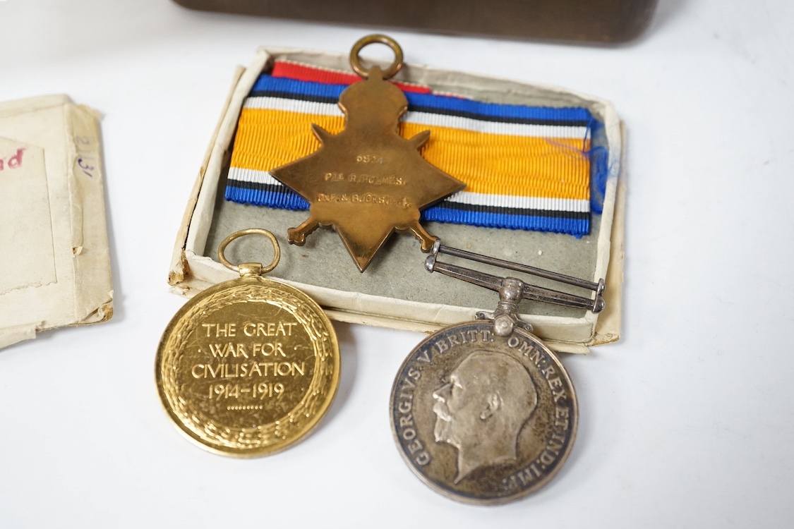 A posthumous First World War medal trio awarded to PTE. R. Holmes Oxf. & Bucks. L.I., together with the issuing letter, the remains of the original card box and a Princess Mary Christmas tin. Condition - fair.
