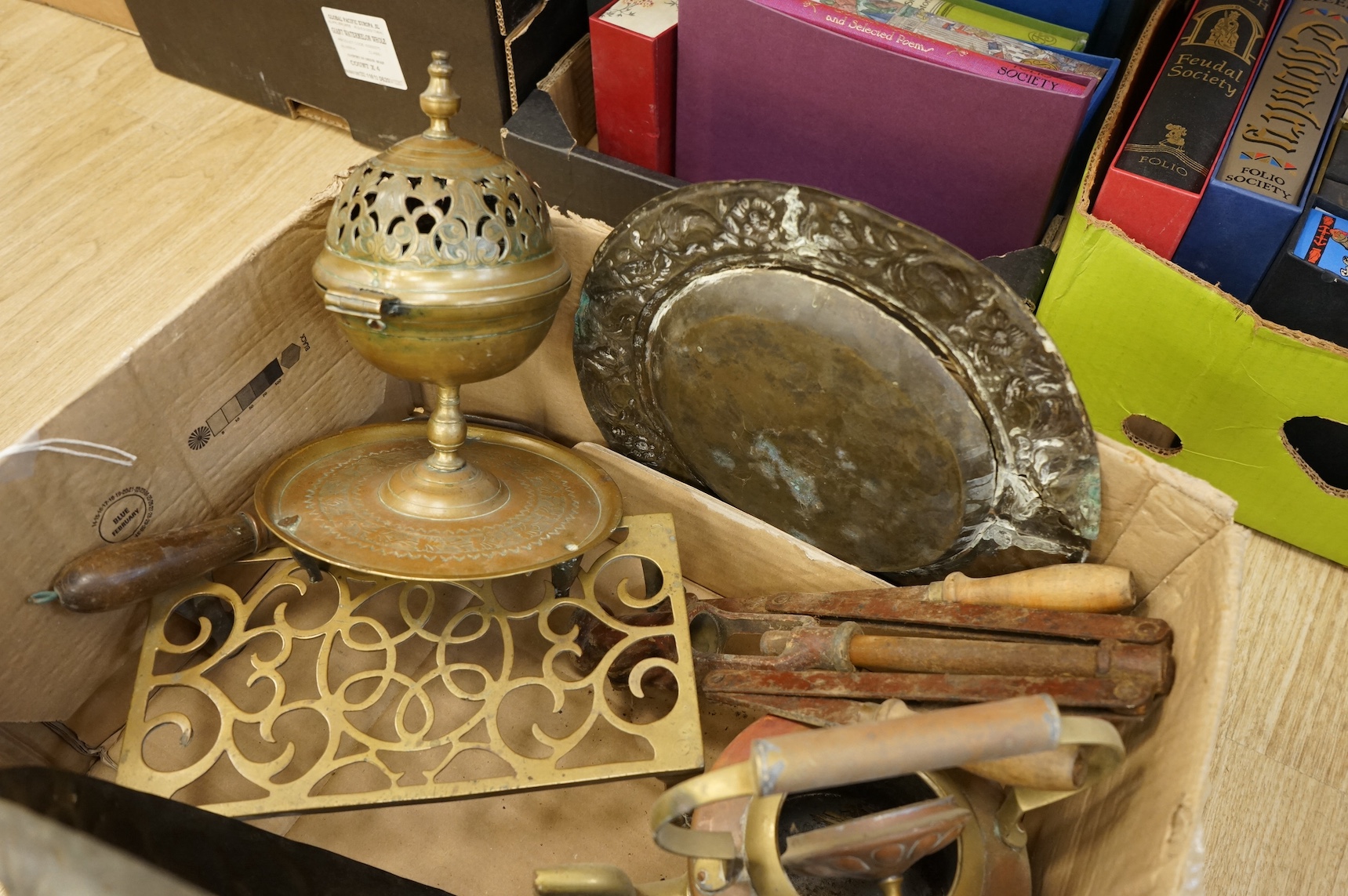 A 17th century Nuremburg embossed brass alms dish, and other metalware, dish 34cm. Condition - worn