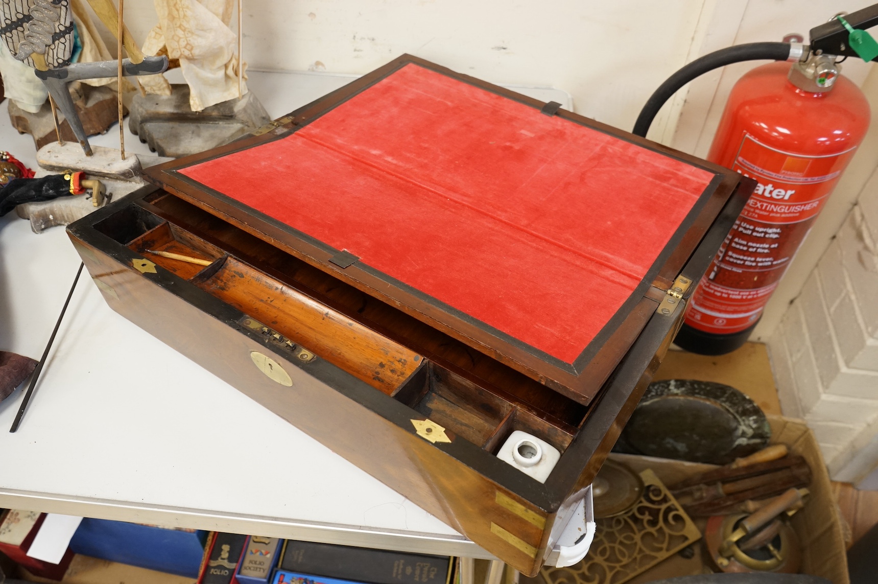Lot 1466 , A Victorian mahogany brass bound writing slope, 50cm x 26cm. Condition - fine crack in veneer to top