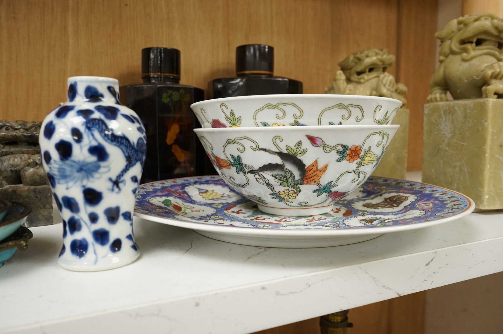 Lot 1385 , A group of mixed Chinese and Japanese ceramics to include soapstone carvings, prunus flower ginger jars, rose quartz Buddha and pair of famille rose bowls. Condition - varies, mostly fair/good