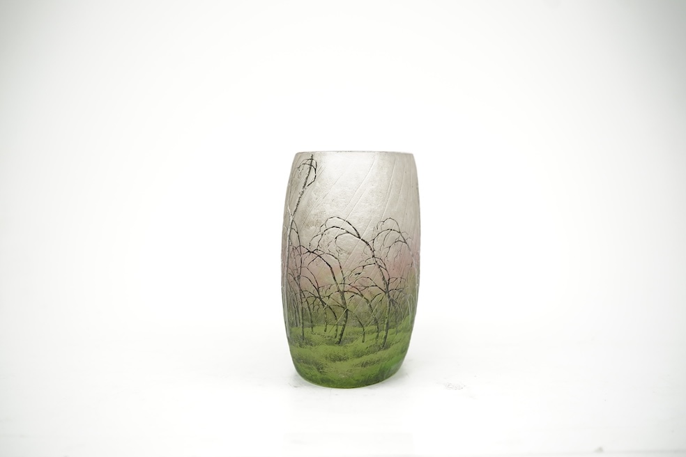 Daum, Nancy: A ‘Rain’ vase, of oval section, the enamelled cameo glass landscape with a continuous autumn scene of bare trees in rain, on a frosted ground, signed in black enamel DAUM NANCY, with the Croix de Lorraine, 10cm high, 12cm wide