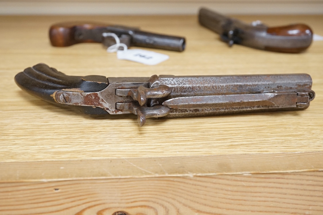Lot 263 , A 20th century double barrel pinfire pistol with sprung bayonet, box lock action, and fluted wooden grip