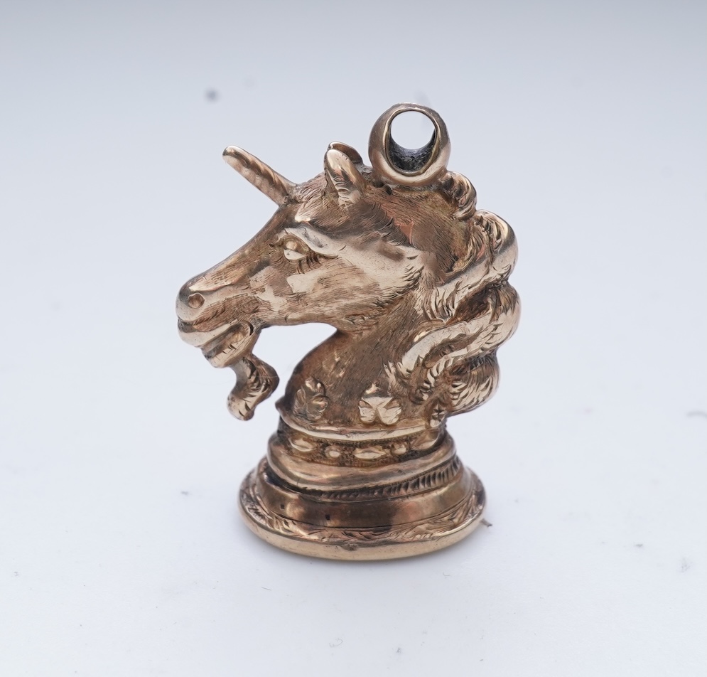 A gold and bloodstone fob seal, late 19th century, modelled as a heraldic horse head collared by a ducal coronet, mounted in gold, set with a plain bloodstone matrix, height 2.5cm, gross weight approximately 3.5 grams