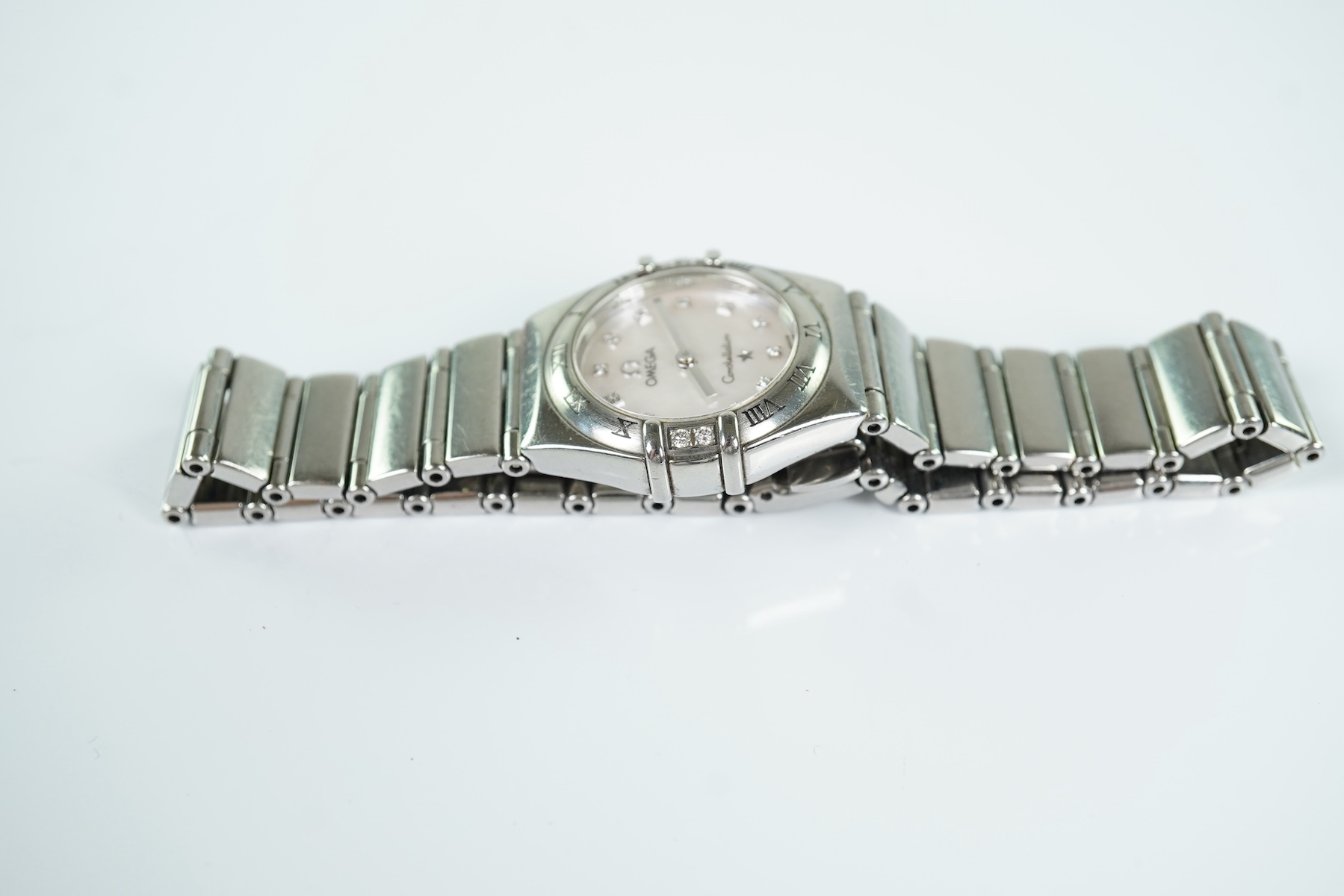 A lady's 2002 stainless steel and diamond set Omega Constellation quartz wrist watch, with mother of pearl dial and diamond dot markers, with bezel with Roman chapter ring and set with four small diamonds, case diameter 23mm, on a stainless steel Omega bracelet, with booklets and warranty cards, no box.