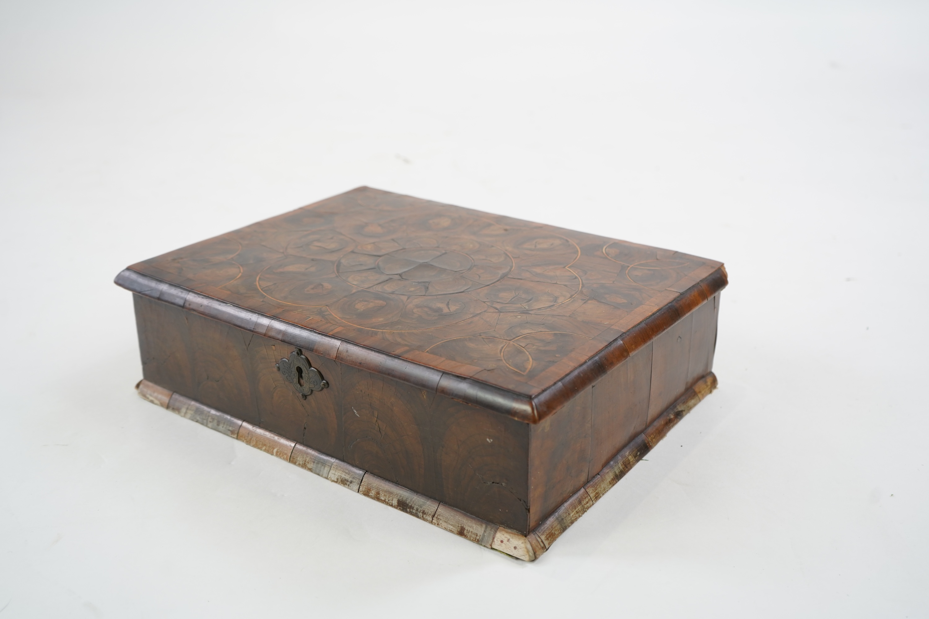 A William and Mary oyster olivewood veneered lace box, inlaid with boxwood stringing, 43.5cm wide, 32.5cm deep