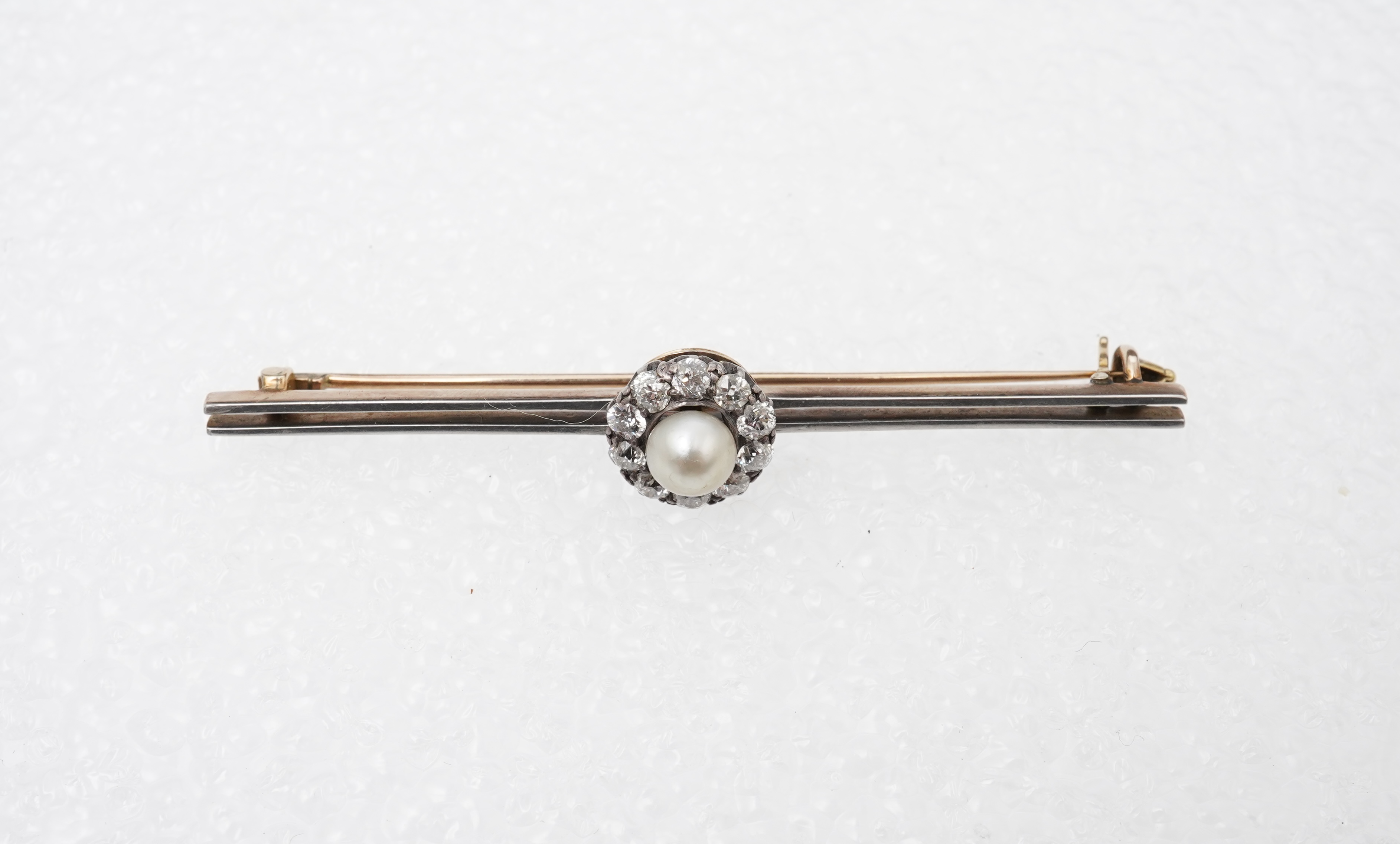 A pearl and diamond brooch, early 20th century, centring on a bouton-shaped pearl measuring approximately 5.5mm diameter, within a border of circular-cut diamonds totalling approximately 0.70 carats, to a bar brooch, mounted in silver and gold, length 6.3cm, pearl untested