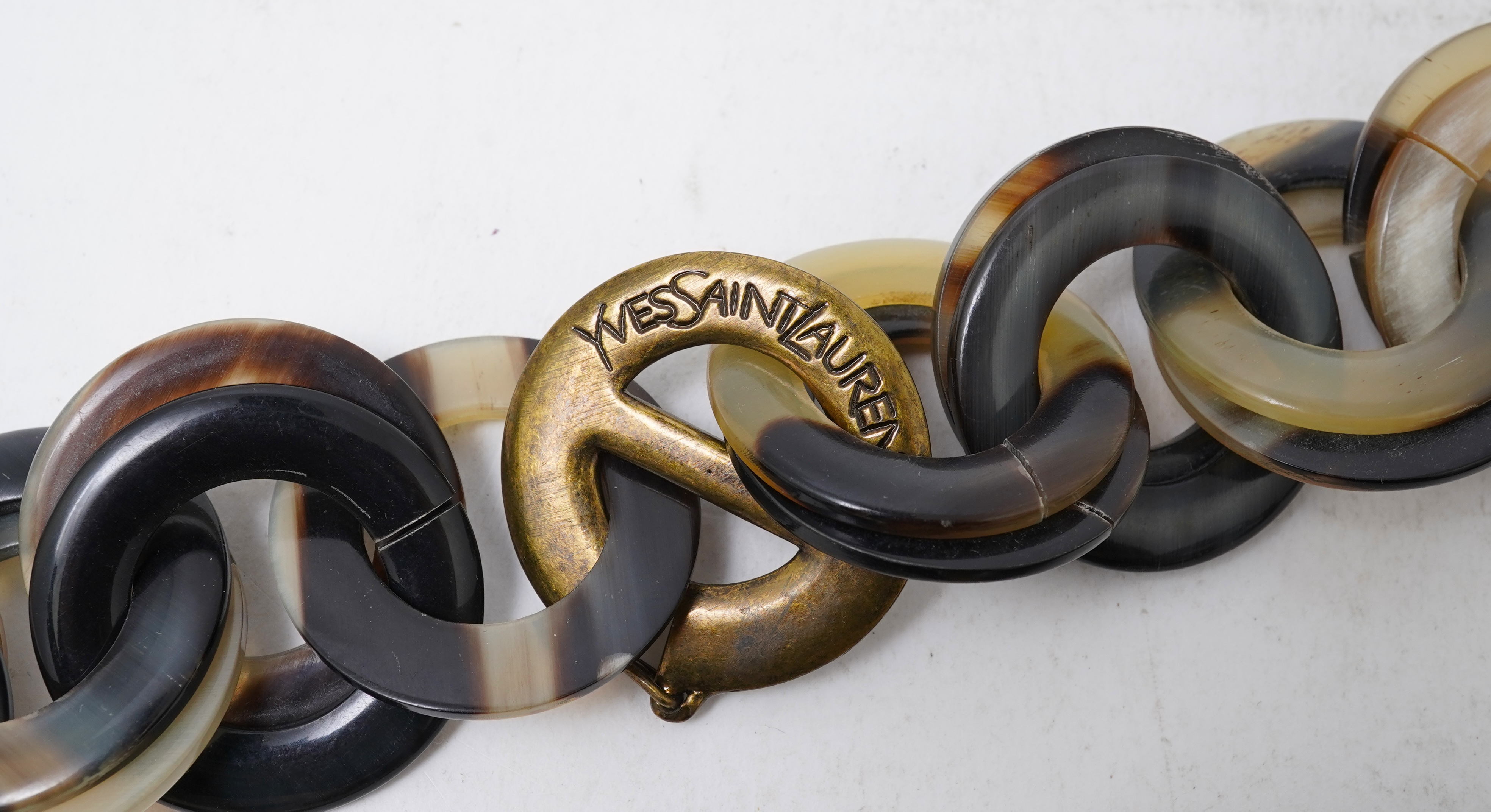 Yves St Laurent, a horn necklace, composed of horn links, to a circular bronze clasp, length 88cm, signed Yves Saint Laurent