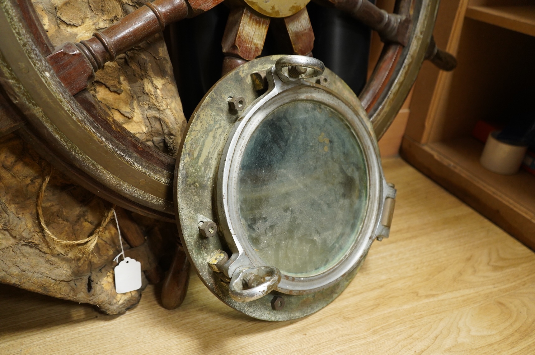 Lot 1628 , A mahogany ships wheel, diameter 80cm, and a brass and chrome porthole, diameter 39cm, by repute off HMS Uganda
