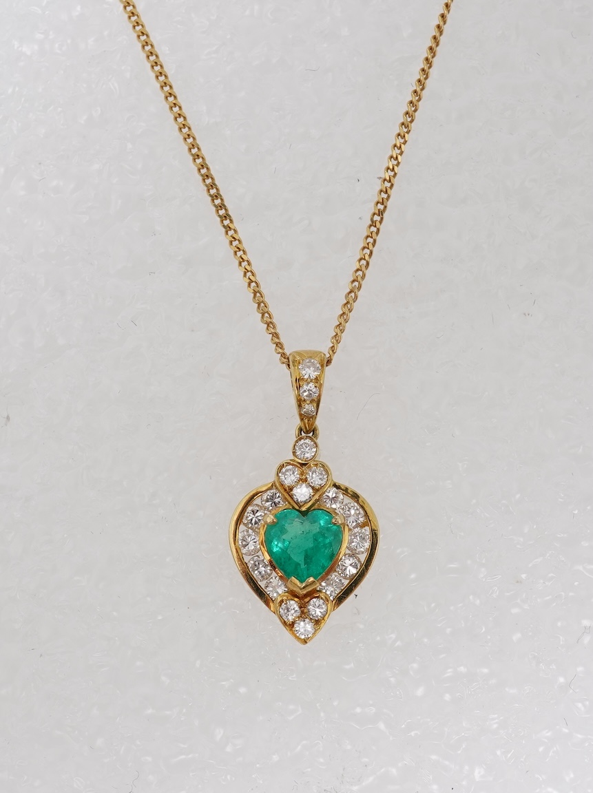 An emerald and diamond pendant, set with a heart-shaped emerald weighing approximately 0.50 carats, within a border set with brilliant-cut diamonds totalling approximately 0.50 carats, to a fine chain necklace, mounted in gold, pendant length 2.4cm stamped 750, chain length 40cm, stamped 585, Italian maker's marks, combined gross weight approximately 5 grams