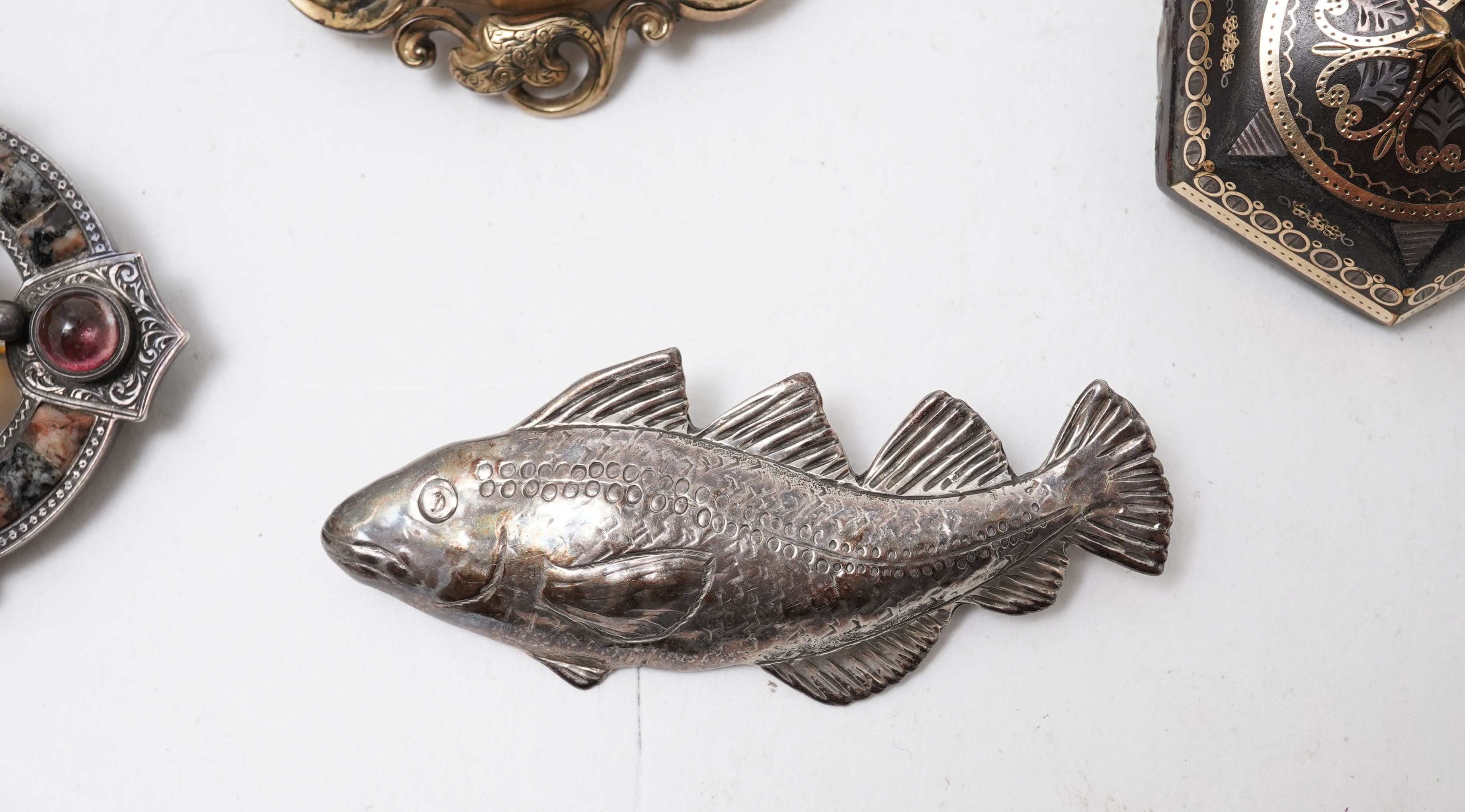 A collection of jewels including a coral necklace, comprising: a coral bead necklace, beads 4.5-8mm, length 38cm; two tortoiseshell piqué work brooches, two Scottish hardstone brooches; a Scottish brooch set with an oval citrine; a silver brooch modelled as a fish; a shell cameo brooch depicting a Muse; an amber cabochon brooch, length 3.8cm; and a hairwork brooch in rolled gold, length 5cm