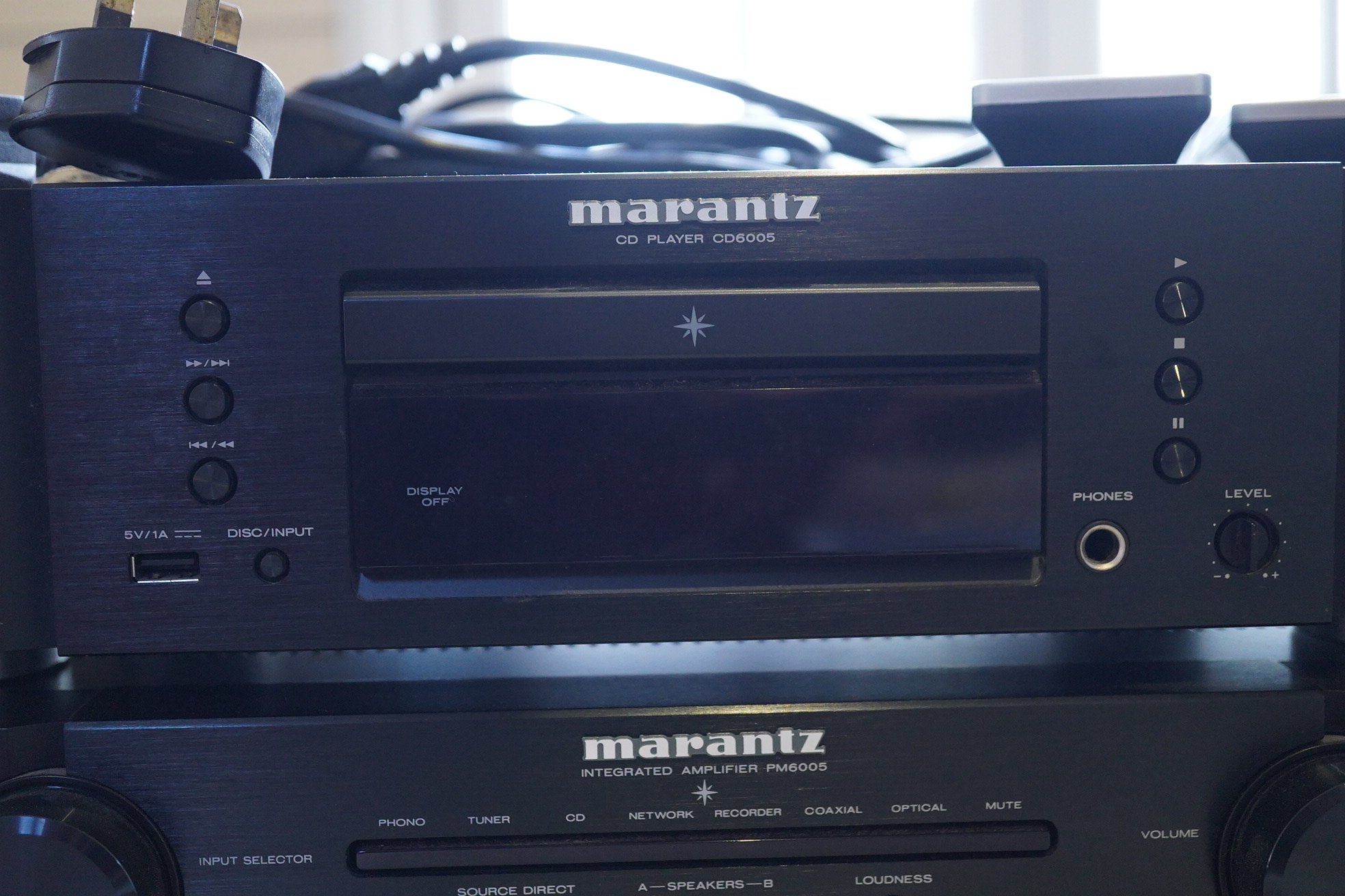 A Marantz HiFi integrated amplifier PM6005, together with a CD player CD6005, plus two remote controls and power leads