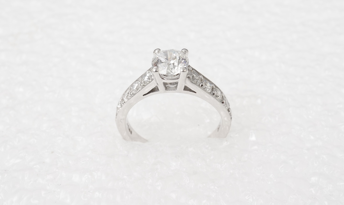 A diamond ring, claw-set with a brilliant-cut diamond weighing 1.00 carat, to shoulders set with brilliant-cut diamonds totalling approximately 0.80 carats, mounted in white gold, size O, stamped 750, gross weight 4.5 grams