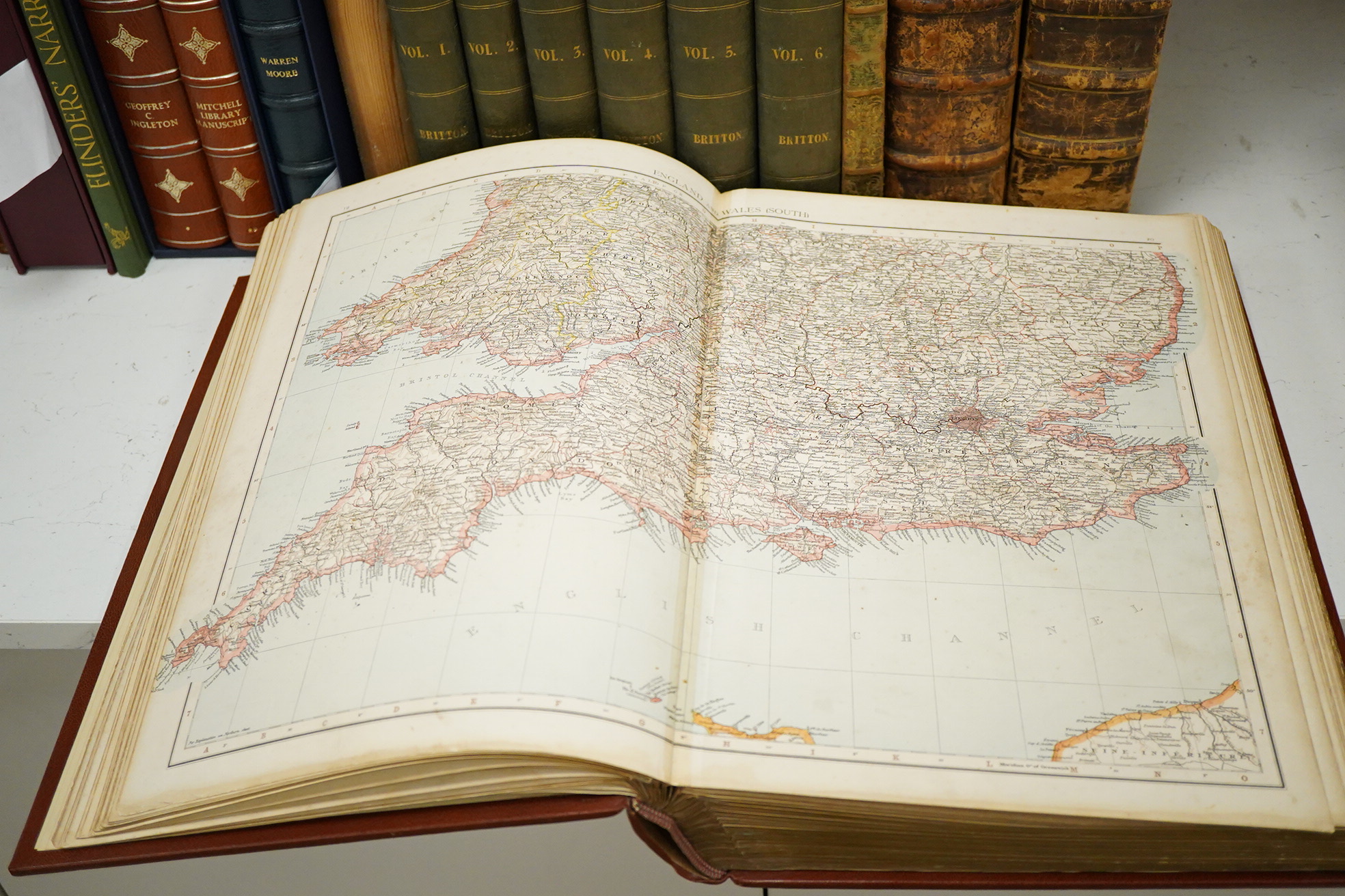 Lot 1303 , "The Times" Atlas ... (new edition) many coloured maps (on 117pp.) and numerous d-page; newly rebound blind ruled and gilt decorated chocolate morocco, gilt lettered, ge., (by Farnborough Abbey bindery), folio. 1895