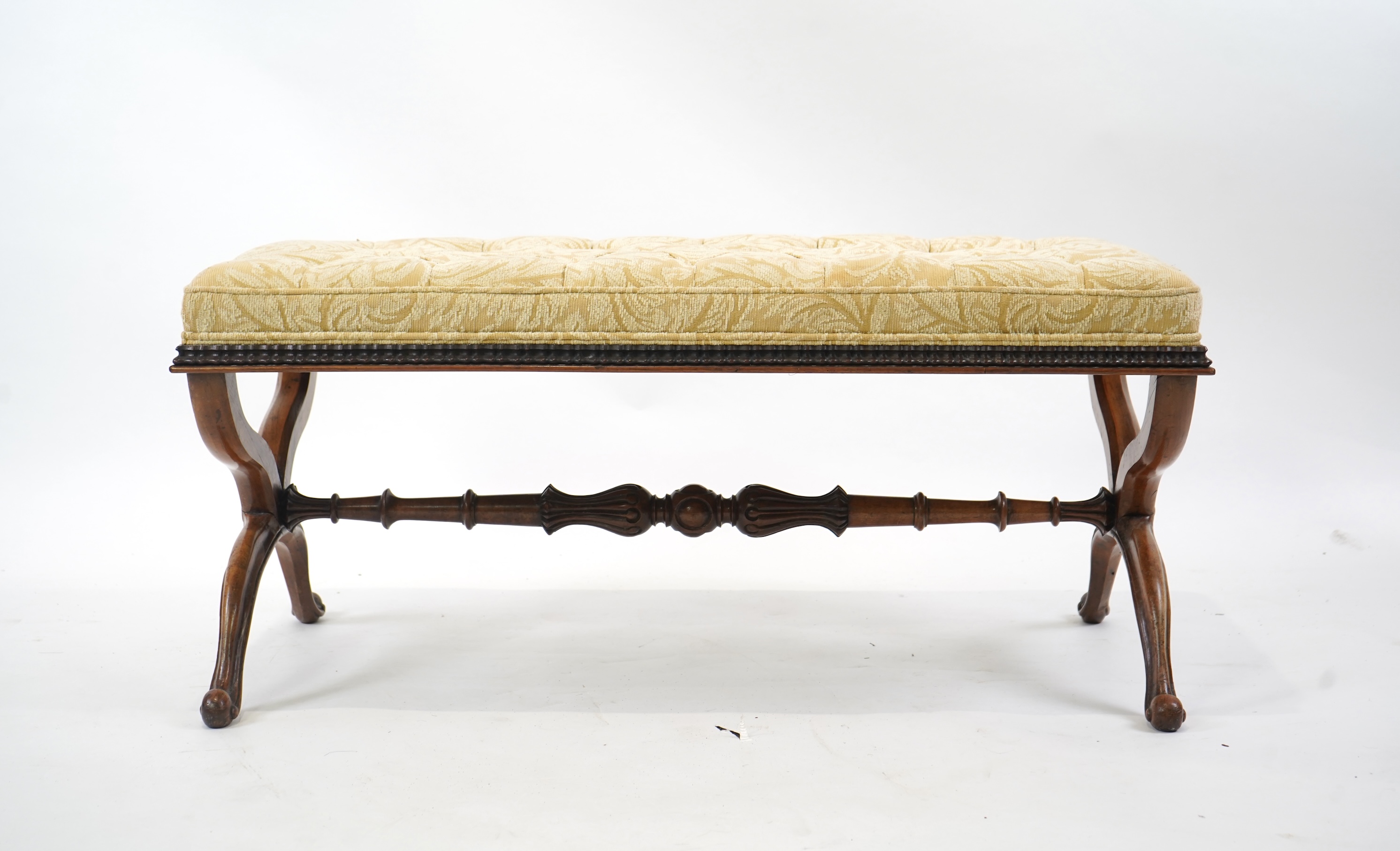 A Victorian faded rosewood rectangular X frame dressing stool with buttoned seat over a ripple moulded rail and carved central stretcher, 102cm wide, 54cm deep, 50cm high