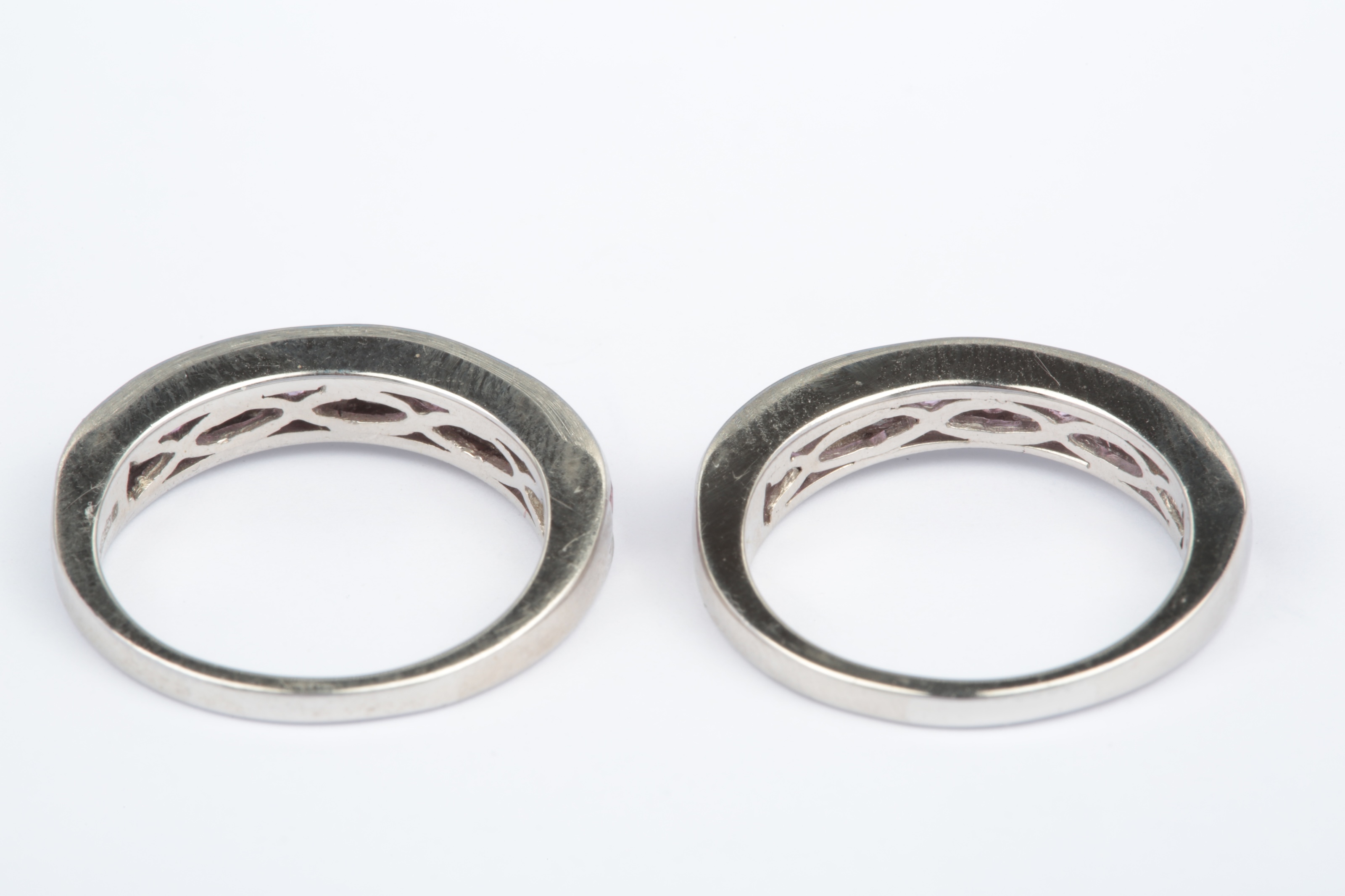 Two pink tourmaline half eternity rings, each channel-set with a line of circular-cut pink tourmalines, mounted in platinum, sizes L1/2 and M1/2, British hallmarks, combined gross weight approximately 10.5 grams