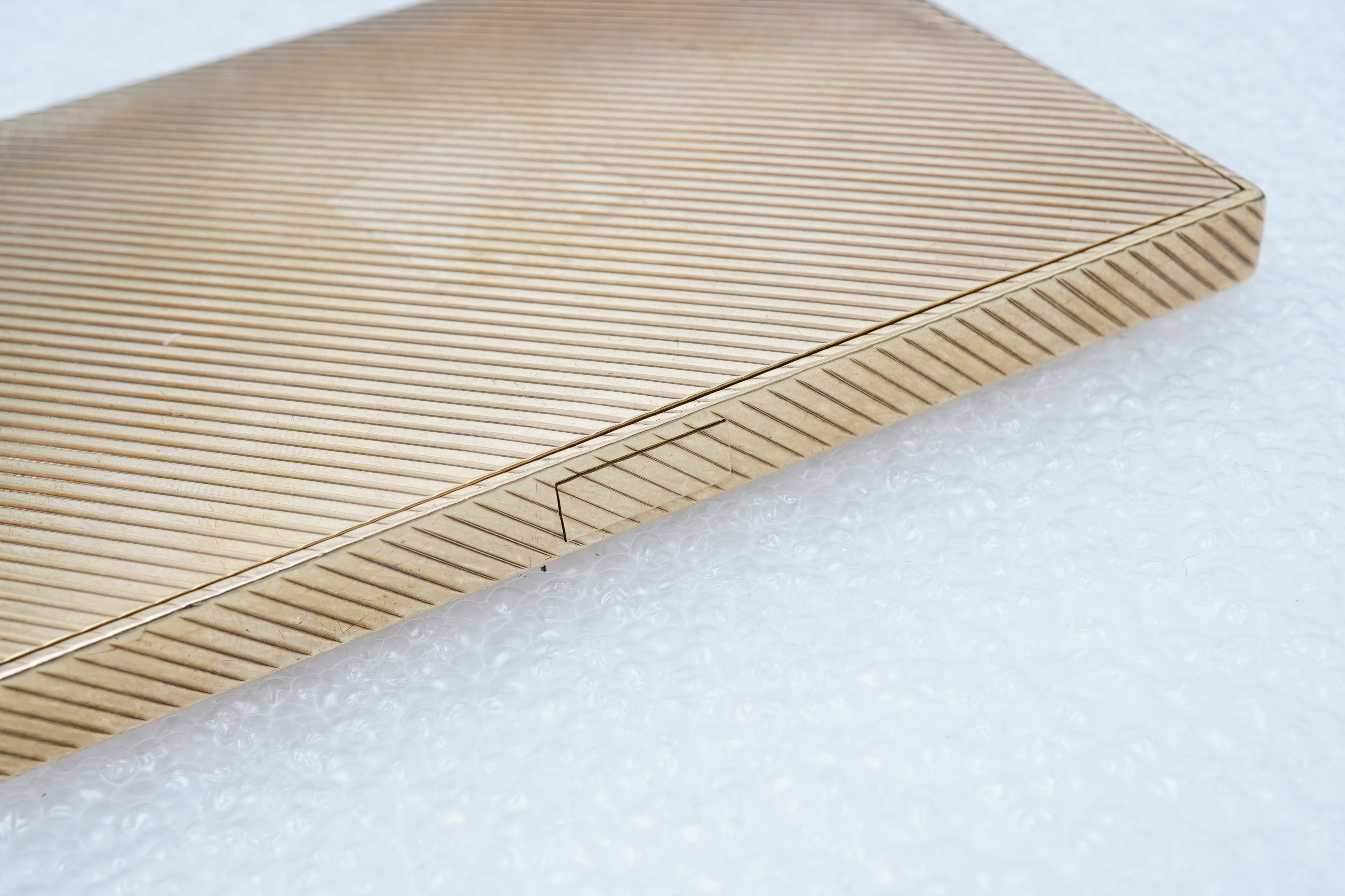 Cartier, a 9ct gold cigarette case, London, circa 1933, of rectangular outline with fluted engraving, opening via a concealed push piece to reveal a plain interior, measuring 10.8 x 7.9 x 0.9cm, signed Cartier London, numbered 2023, British hallmarks for 9ct gold, sponsor's mark JC for Cartier London, date letter for 1933, gross weight approximately 158 grams