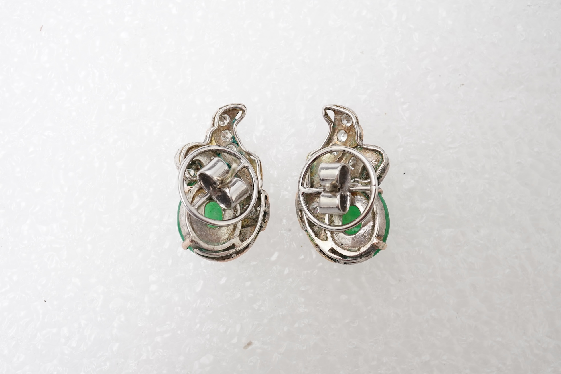 Generally in good condition, jadeite well-matched, good colour and translucency, some surface-reaching fissures. Diamonds bright and lively. Mount material unknown - possibly white and rose gold, possibly silver. Post fittings slightly bent.