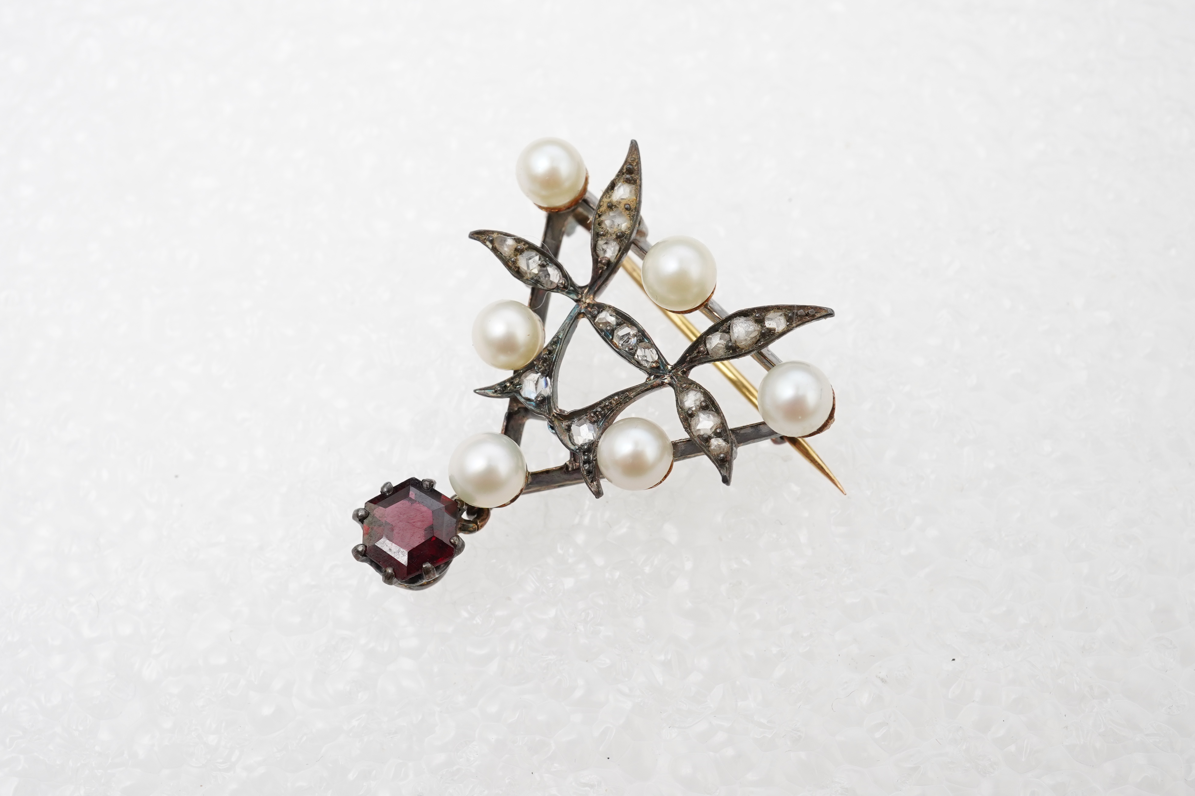A pearl, garnet and diamond brooch, of foliate design, set with rose-cut diamonds and pearls, suspending a hexagonal step-cut garnet drop, mounted in silver and gold, length 3.3cm, pearls untested